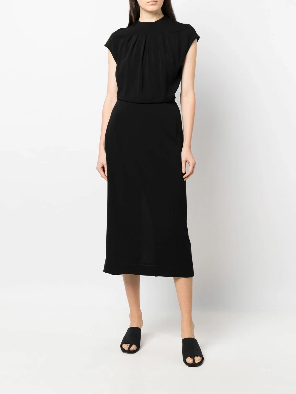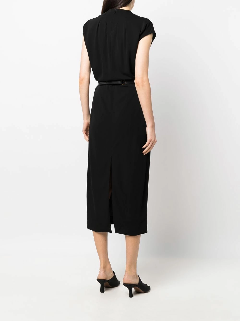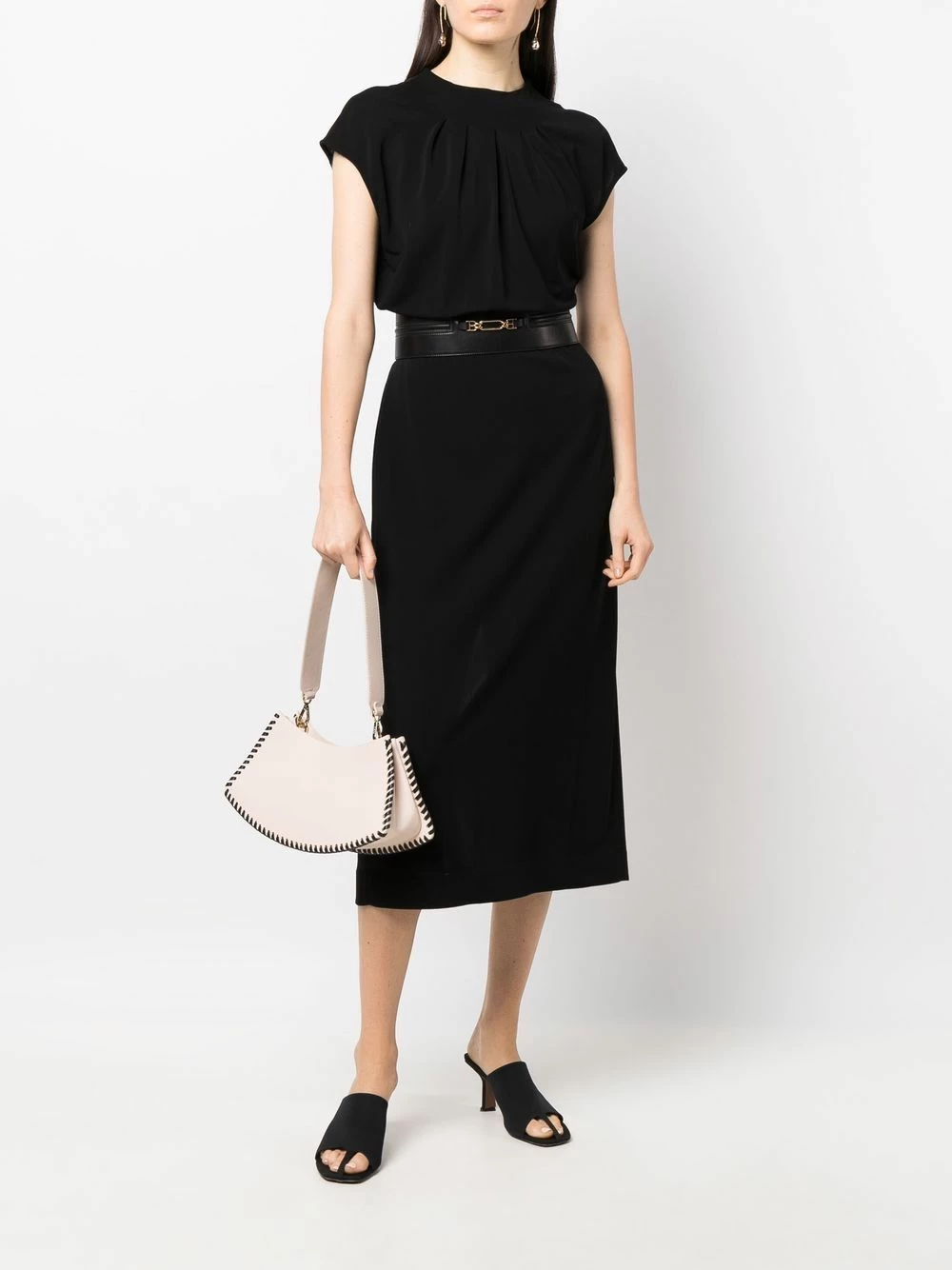 Taille ceinturée, plaque logo dorée, détails de fronces, encolure ras du cou, fermeture zippée à l’arrière, manches courtes, coupe mi-longue. Couleur : noir.