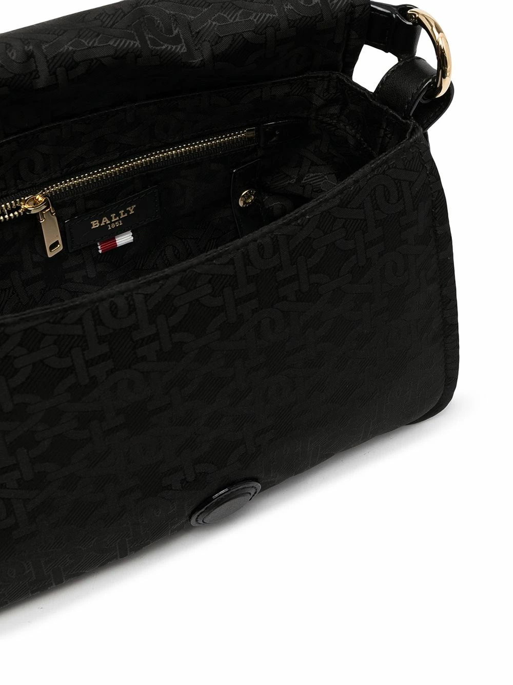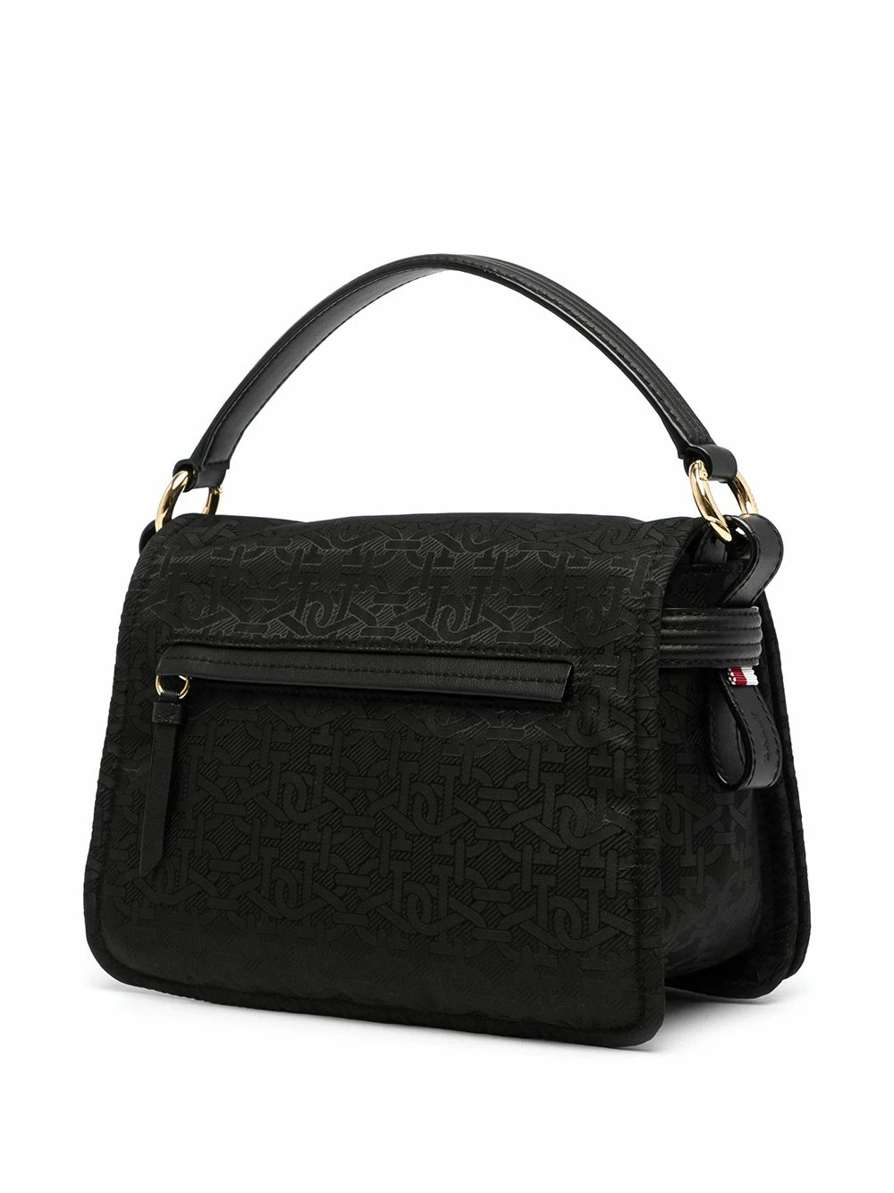Motif monogrammé, plaque logo dorée, anse plate sur le dessus, rabat sur le dessus, poche arrière zippée, poches intérieures zippées. Couleur : noir.