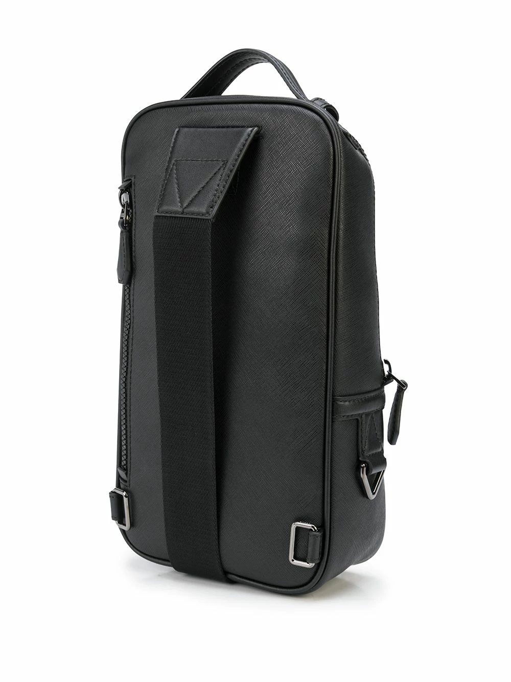 Logo argenté, détails rayés, fermeture zippée sur le dessus, compartiment principal, anse plate sur le dessus. Matière : cuir.