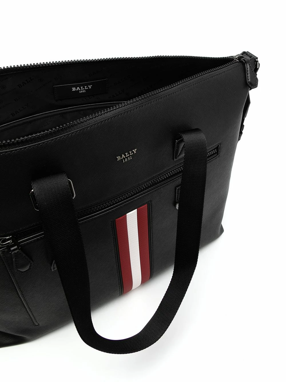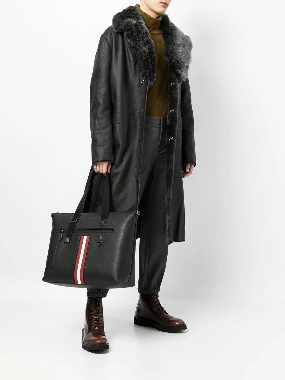 Imprimé à rayures, plaque logo, anses sur le dessus, fermeture zippée sur le dessus, poche zippée sur le devant, poche intérieure plaquée, bride porté épaule ajustable. Couleur : noir. Matière : cuir.