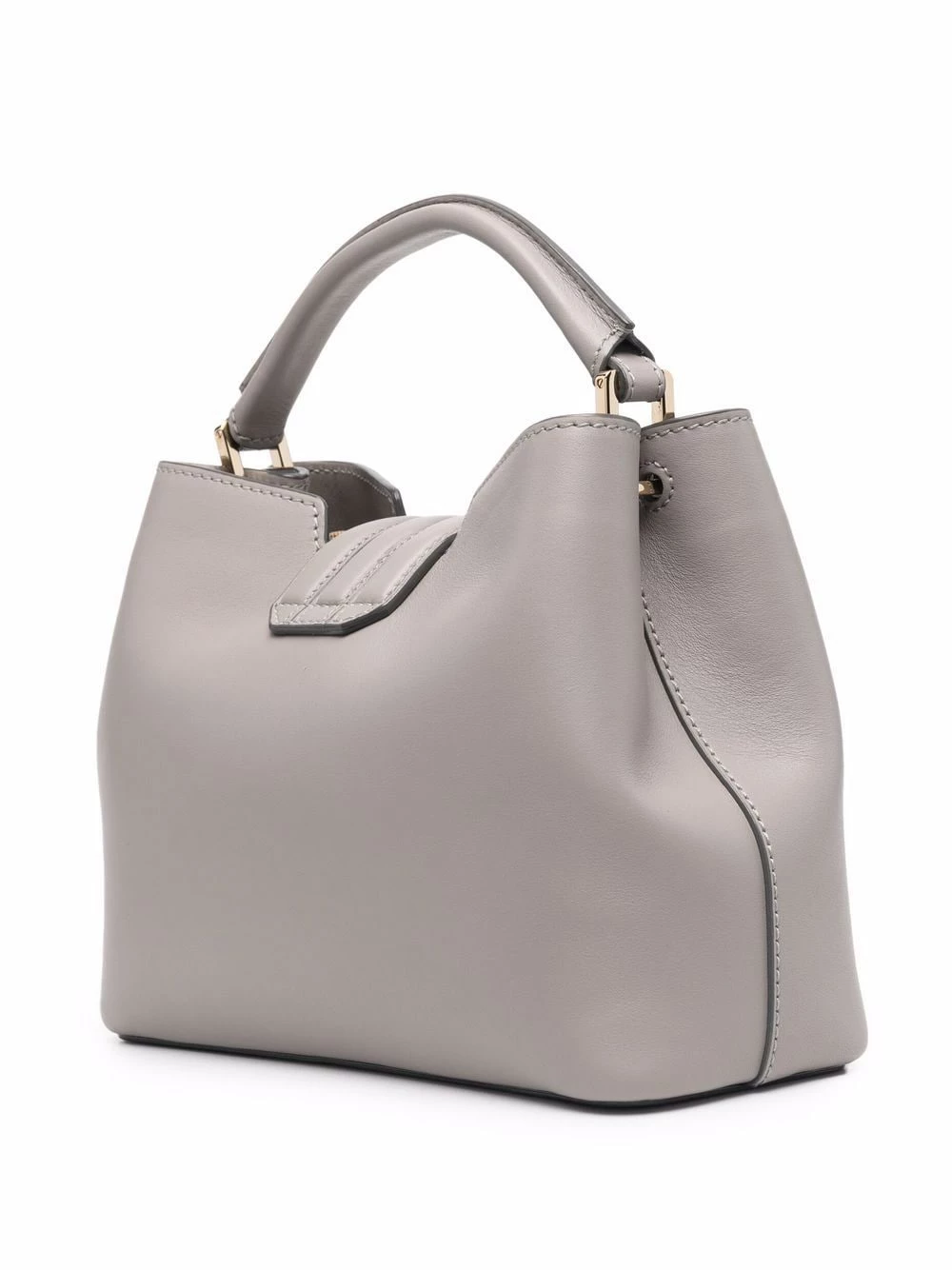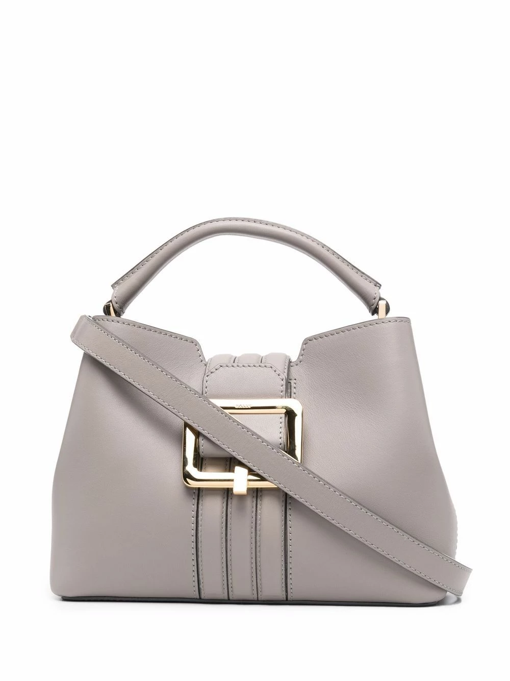 Finitions en métal doré, rabat sur le dessus à fermeture magnétique, bride porté épaule détachable et ajustable, anse classique, compartiment principal, poches intérieures zippées. Matière : cuir.