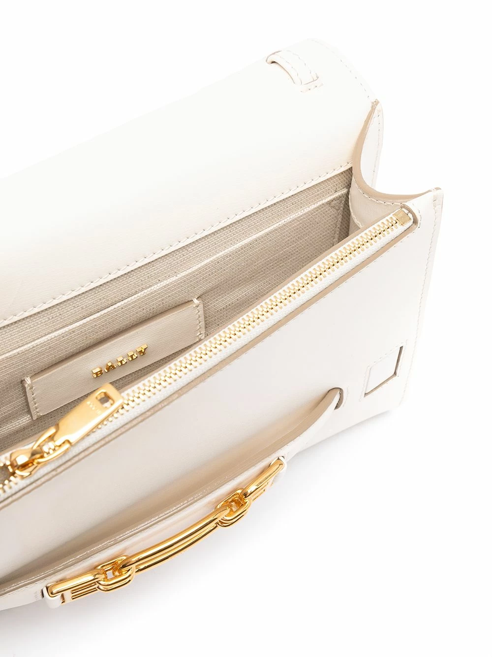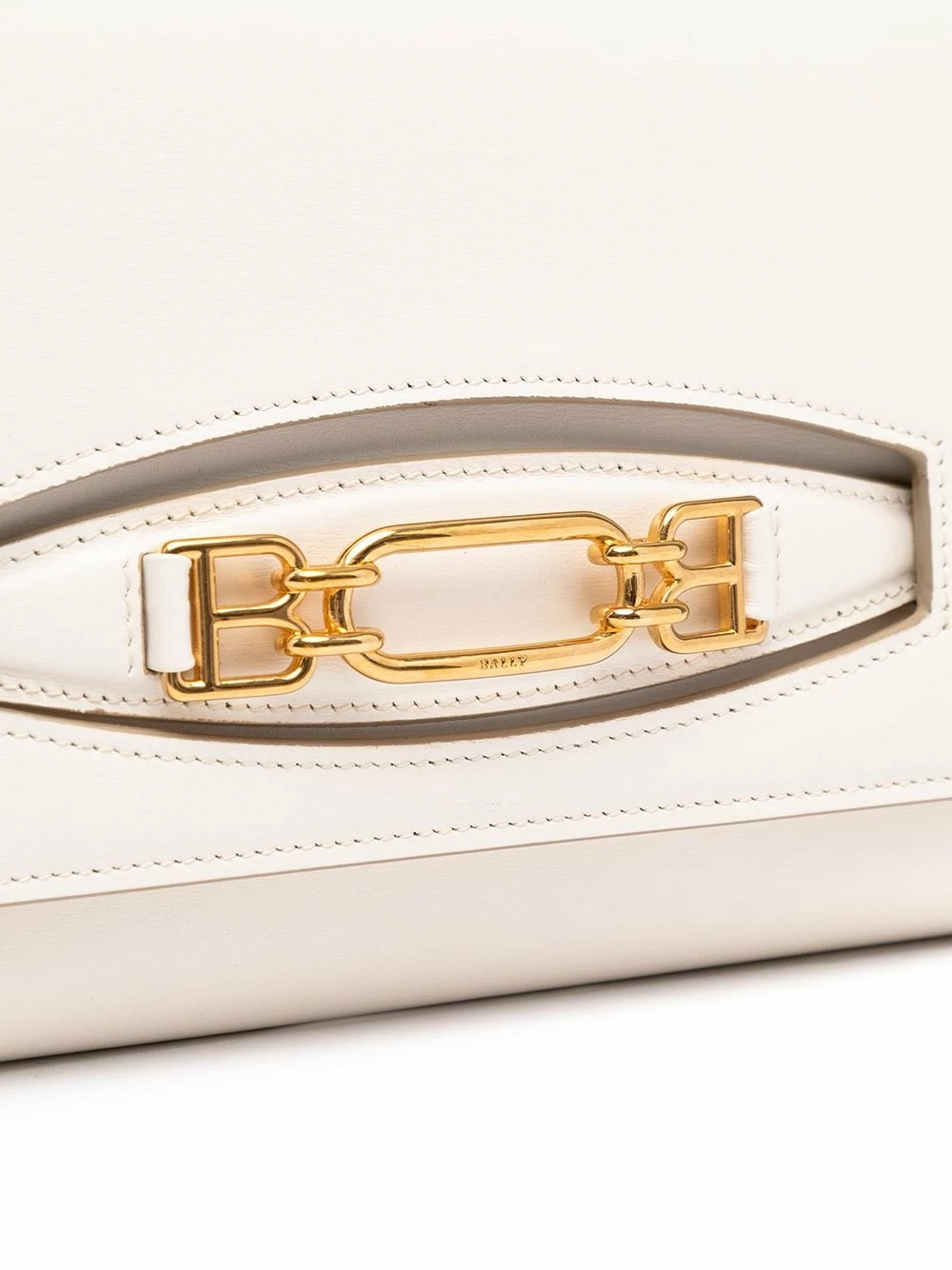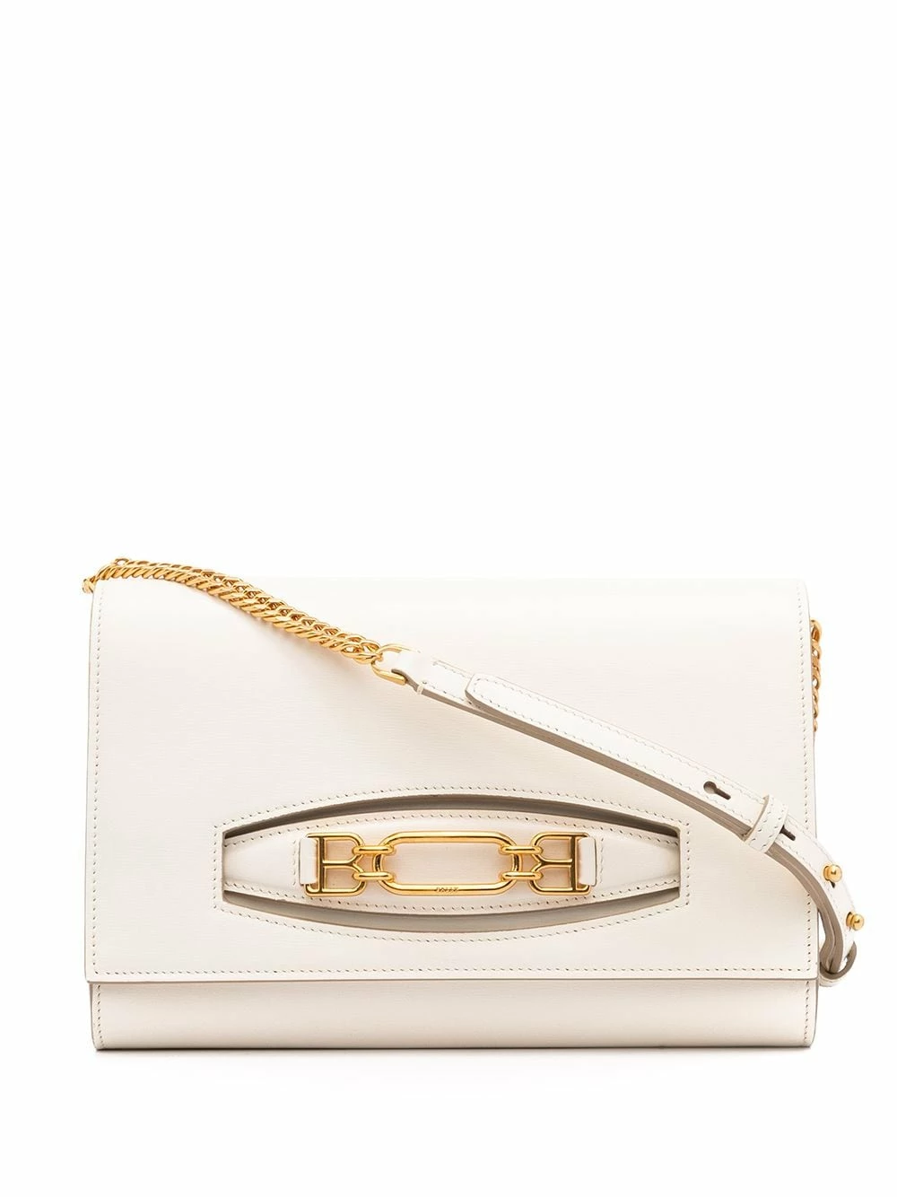Plaque logo dorée, rabat sur le devant, poche zippée sur le devant, bride porté épaule en cuir et maillons de chaîne. Couleur : blanc. Matière : cuir.