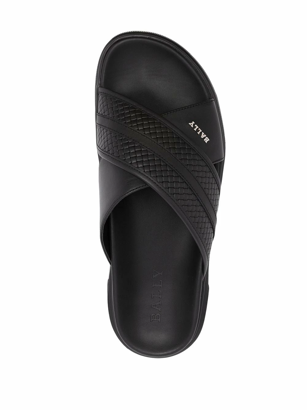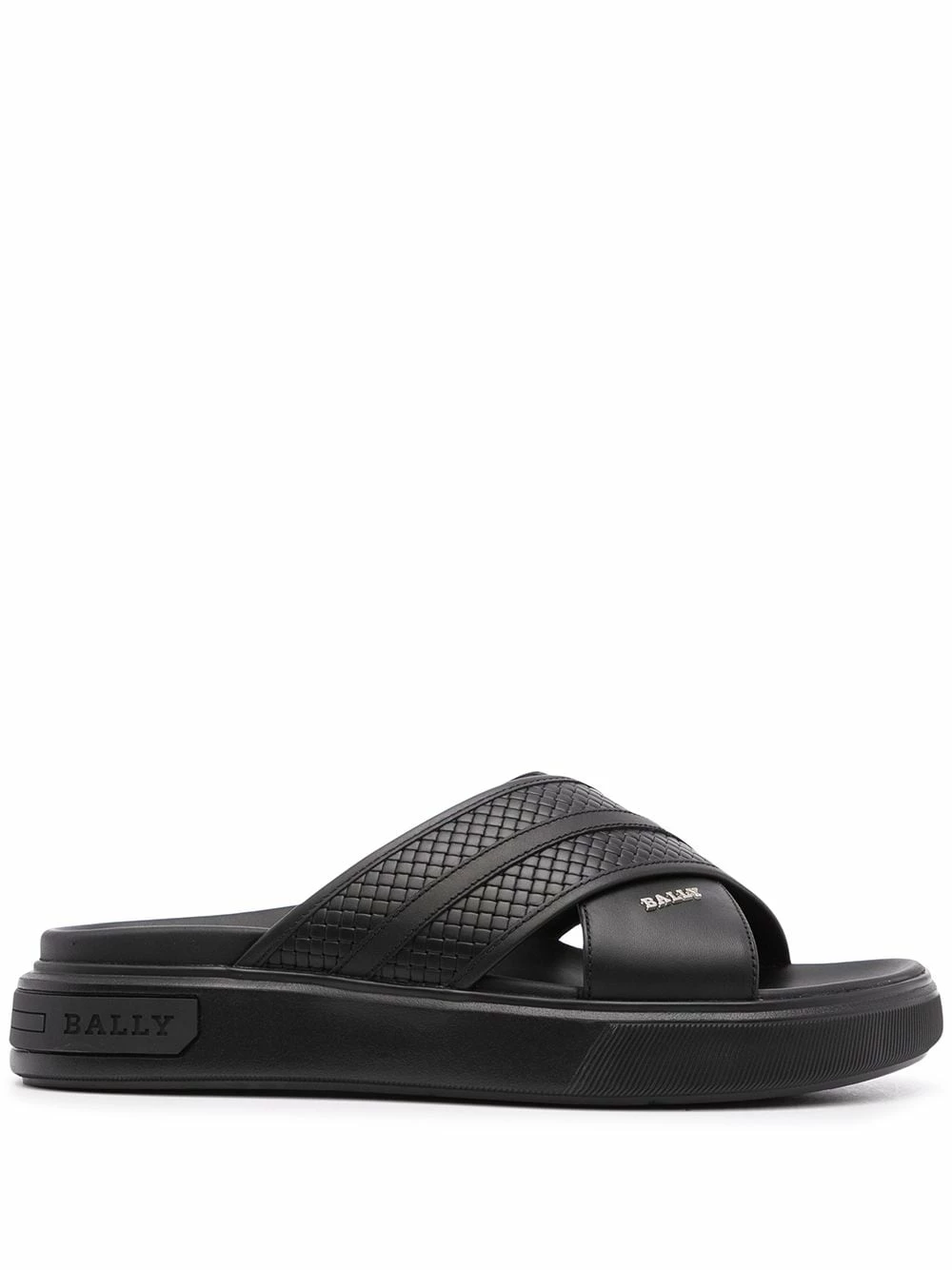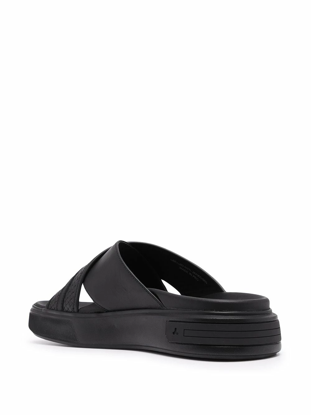 Bout ouvert, brides croisées aux orteils, bout ouvert, semelle plate en caoutchouc. Couleur : noir. Matière : cuir.