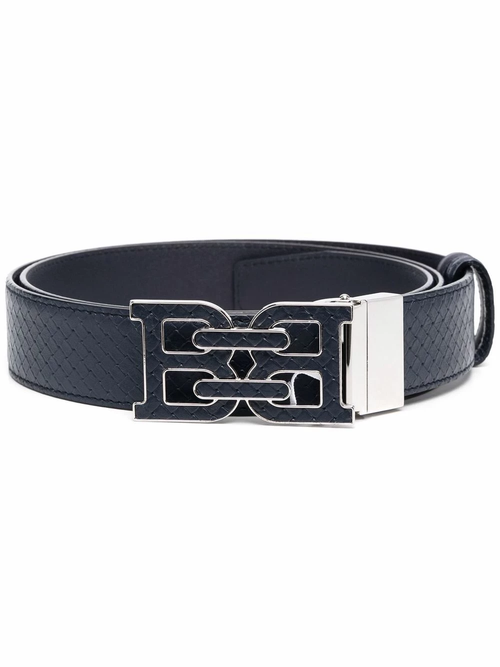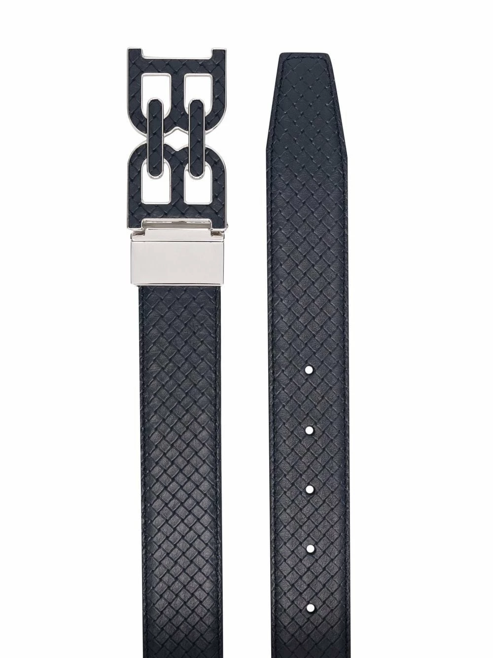 Taille ajustable, design tissé, détail émaillé, fermeture à boucle logo, trous percés. Matière : cuir de veau.