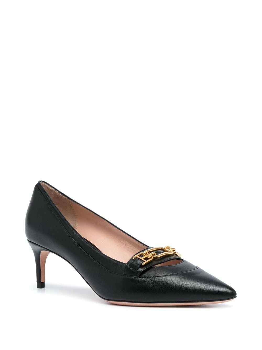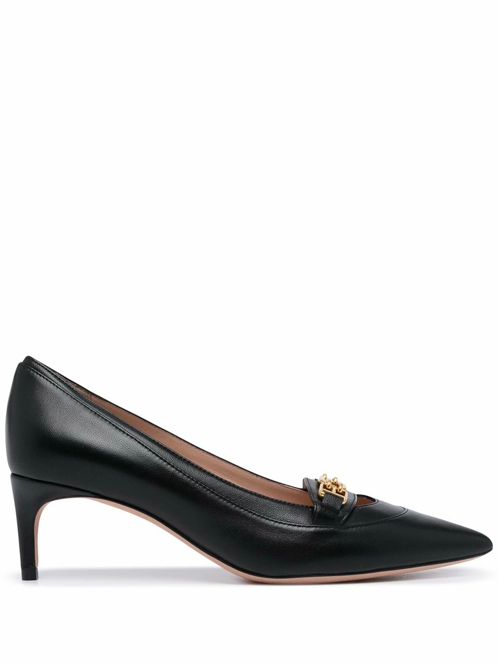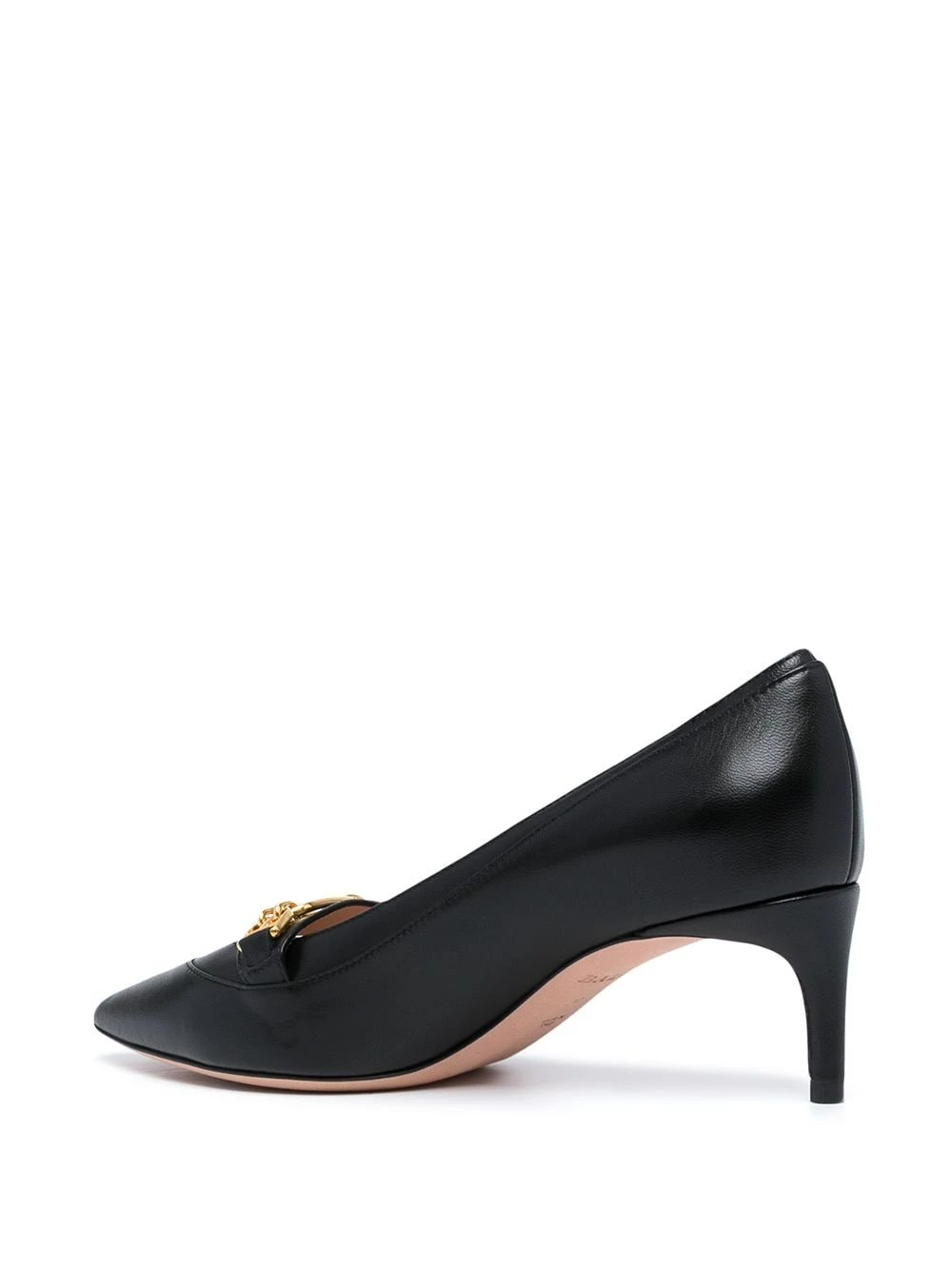 Noir, cuir, talon mi-haut, bout pointu, plaque logo dorée.
