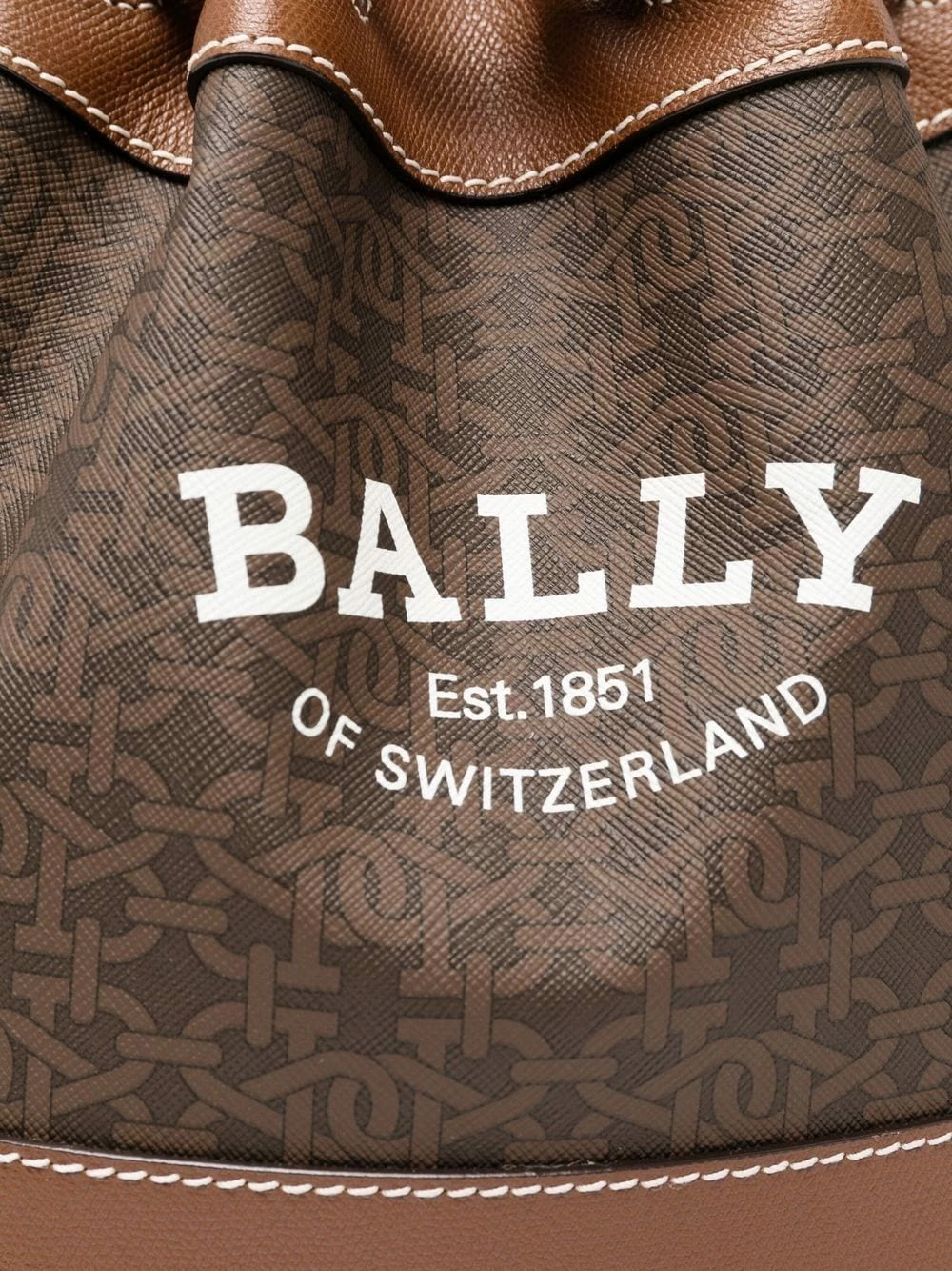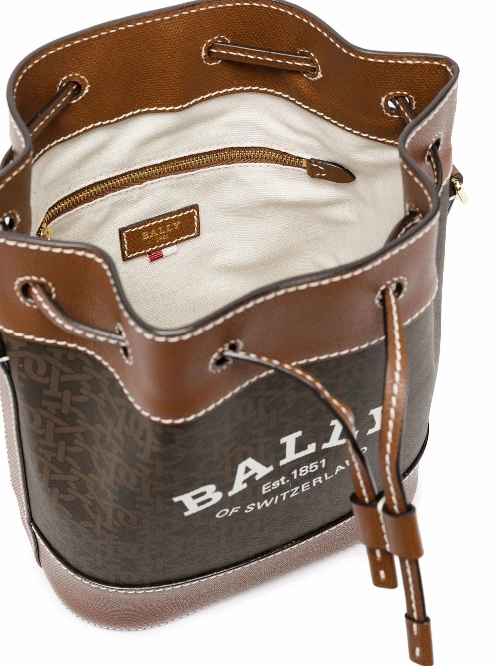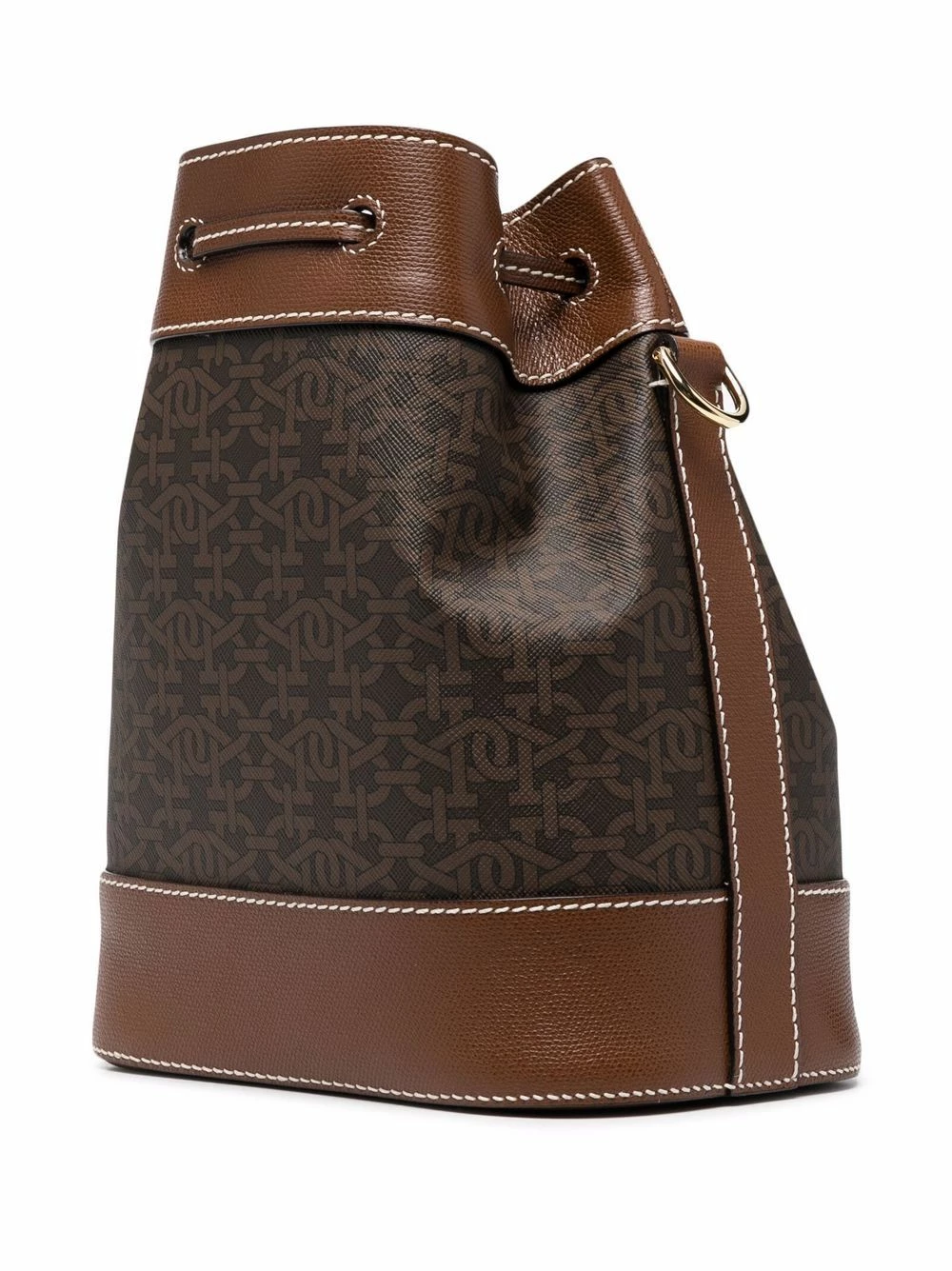 Logo imprimé sur le devant, motif monogrammé, coutures contrastantes, fermeture duffle-coat sur le devant, compartiment principal, bretelle portée épaule unique. Couleur : marron. Matière : cuir.