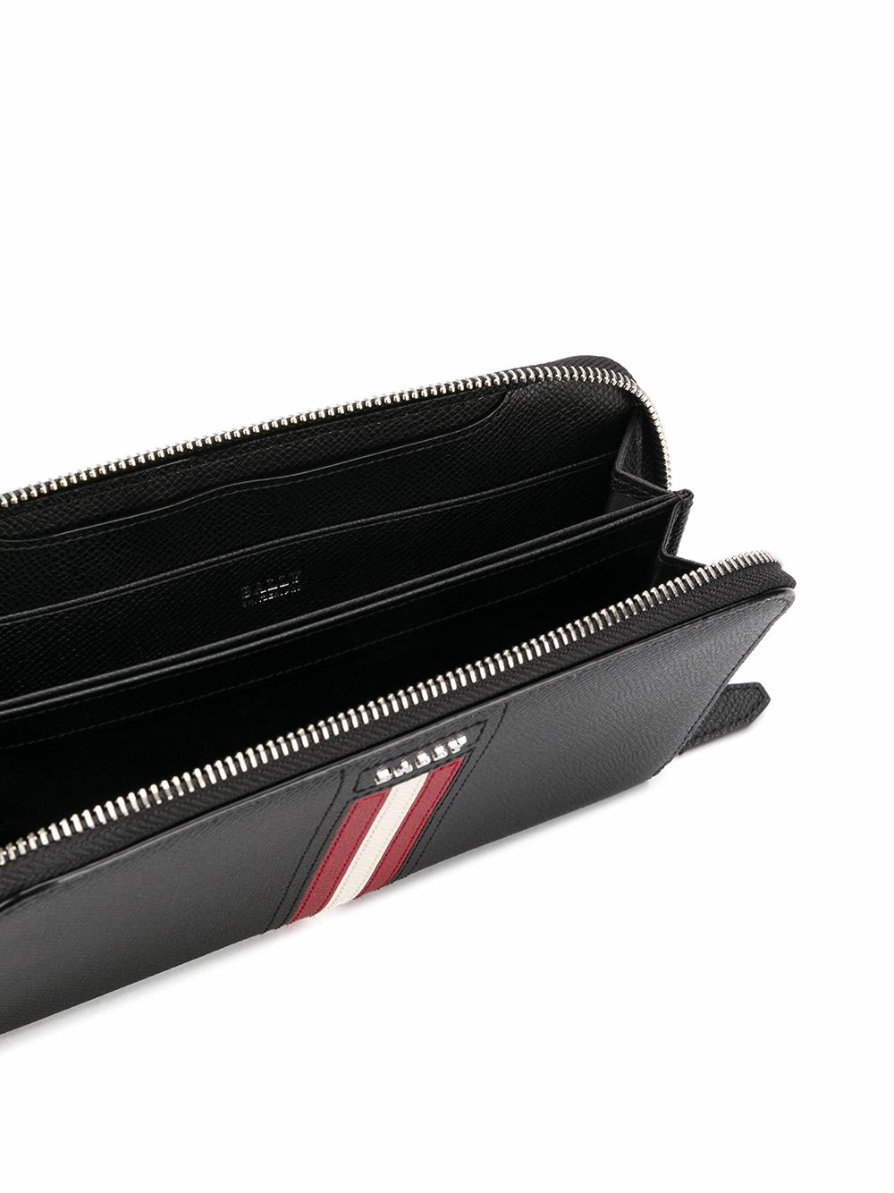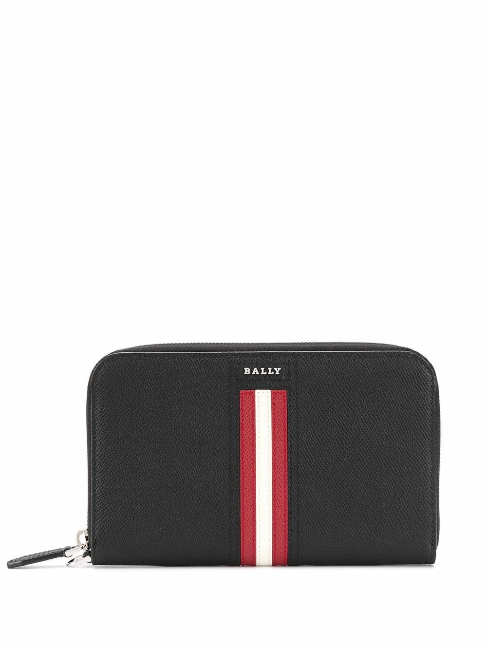 Portefeuille zippé à logo en cuir Bally avec fermeture zippée sur le dessus, compartiment intérieur, compartiments porte-cartes et plaque logo sur le devant. Couleur : noir.