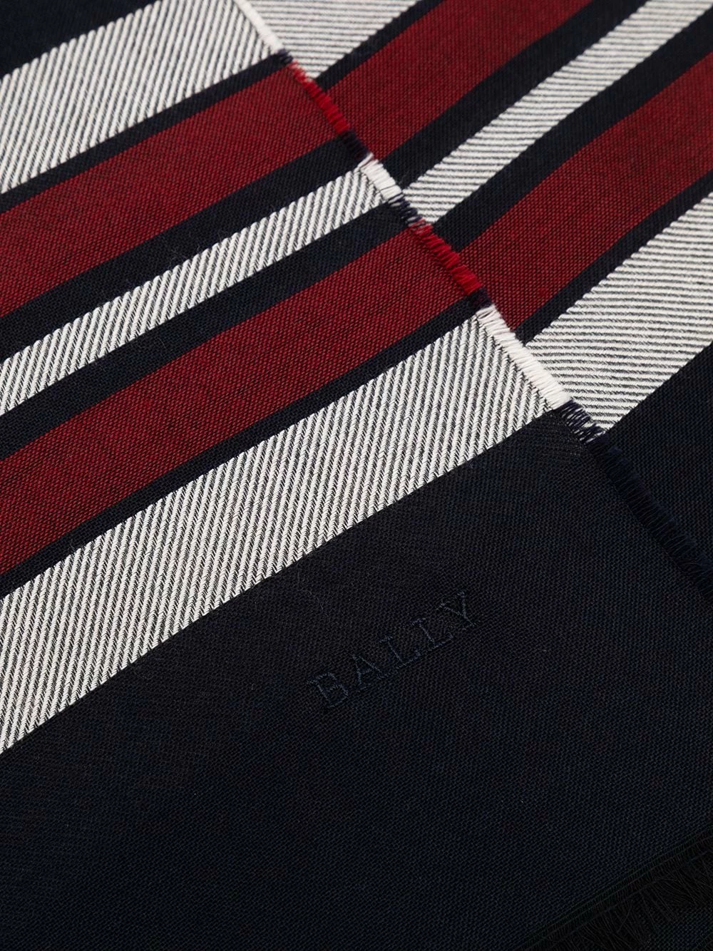 Rayures horizontales imprimées, bordure à franges, effet brut.