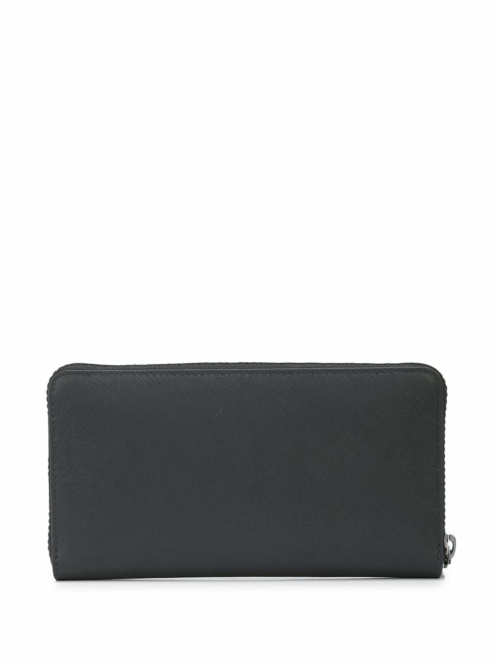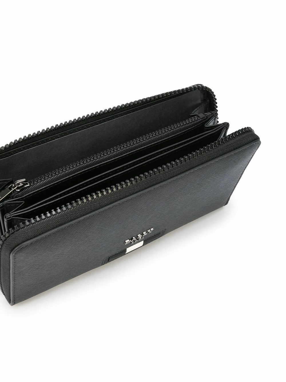 Plaque logo argentée, détails rayés, fermeture zippée tout autour, compartiments intérieurs pour carte, poches intérieures zippées, plusieurs poches intérieures plaquées. Couleur : noir. Matière : cuir.