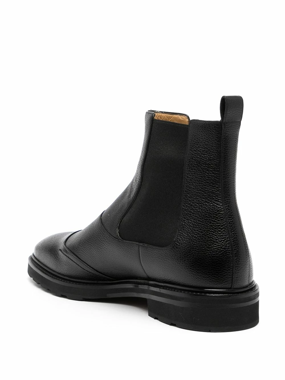 Hauteur cheville, languette d’enfilage au talon, empiècements élastiqués sur les côtés, bout rond, semelle intérieure à logo, semelle plate en caoutchouc. Couleur : noir. Matière : cuir.