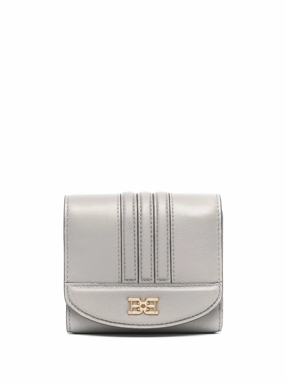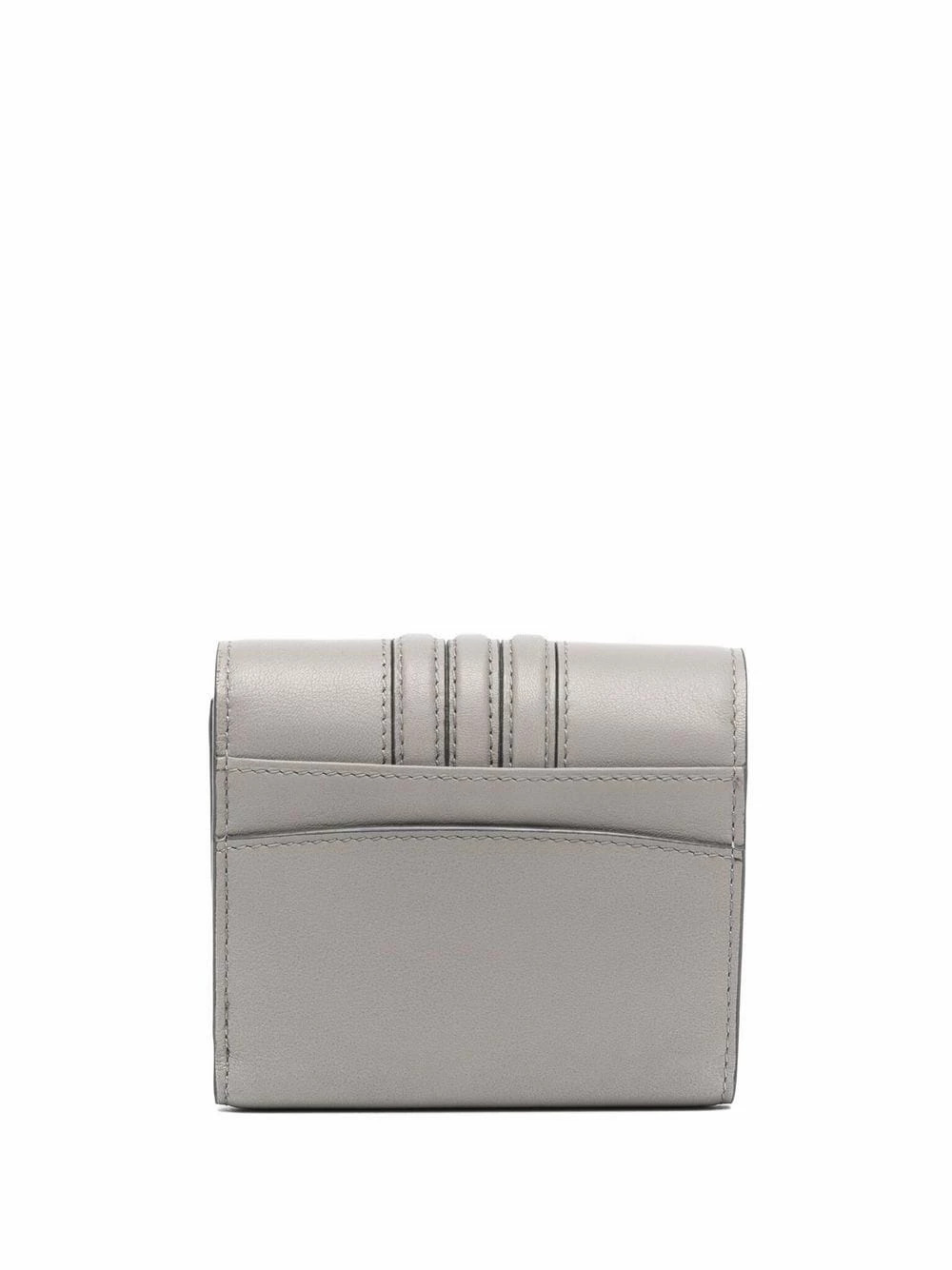 Plaque logo dorée, dessus à rabat avec bouton pression, compartiments intérieurs pour carte, poche ticket. Couleur : gris. Matière : cuir.
