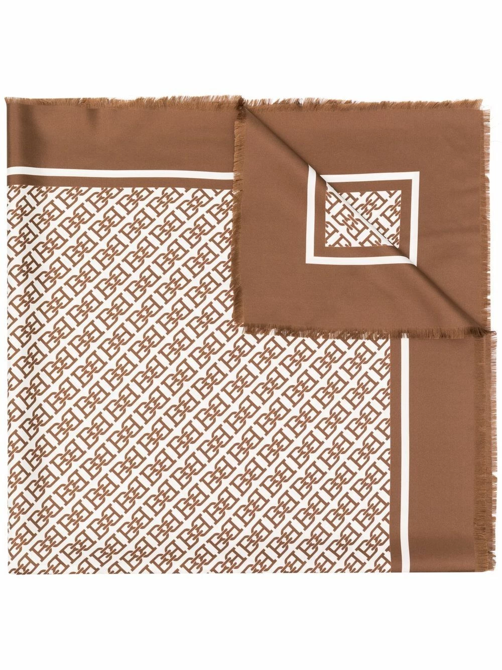 Imprimé monogrammé, bordures rayées, bords frangés. Matière : soie.