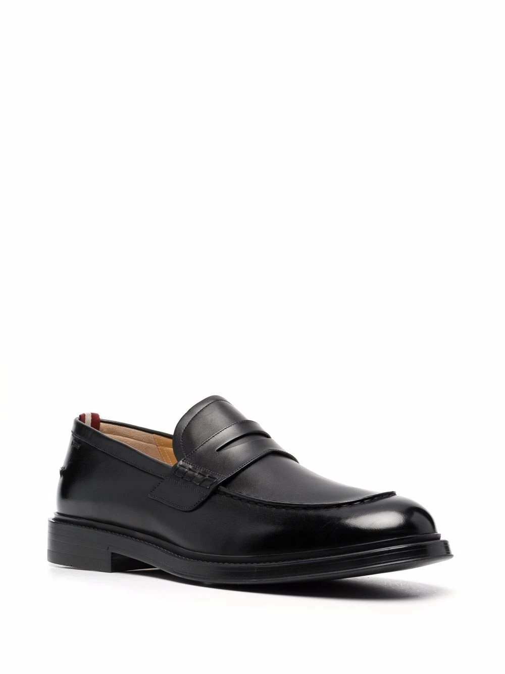 Design à enfiler, bout rond, semelle intérieure griffée, petit talon bottier. Couleur : noir. Matière : cuir.