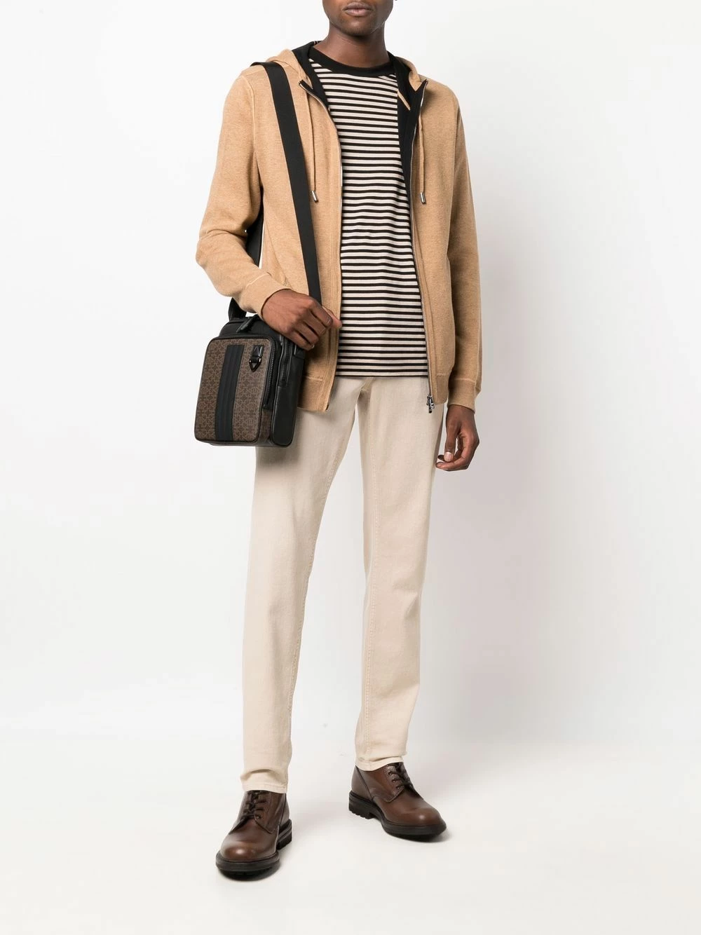 Fermeture zippée à double sens, bride porté épaule ajustable, anse classique, compartiment principal, compartiment zippé sur le devant. Matière : coton.