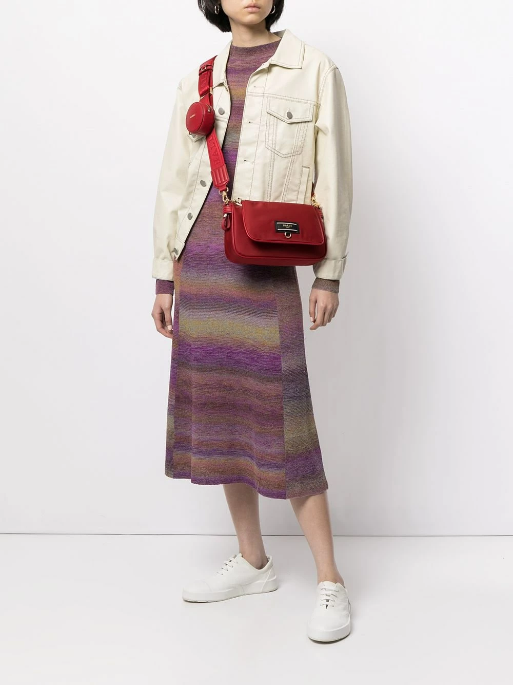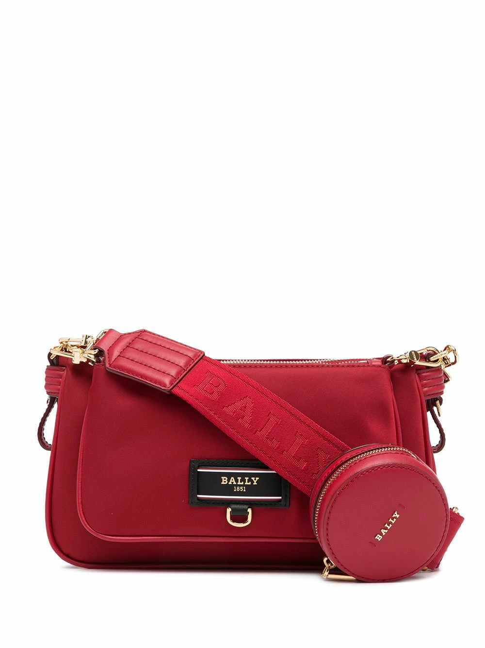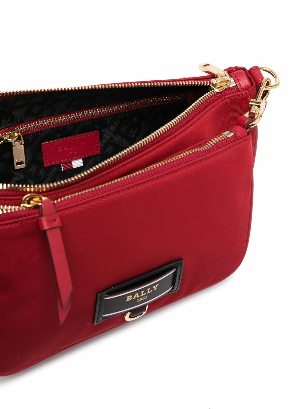 Plaque logo, finitions en métal doré, bride porté épaule détachable et ajustable, rabat sur le devant, poches multiples zippées, poches intérieures zippées, pochette détachable. Couleur : rouge.