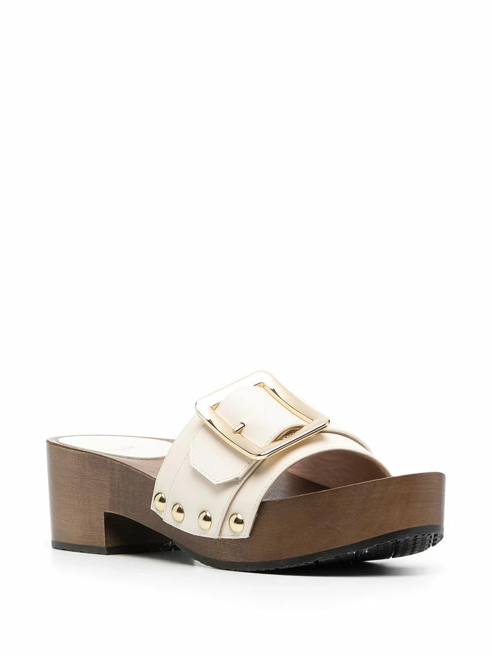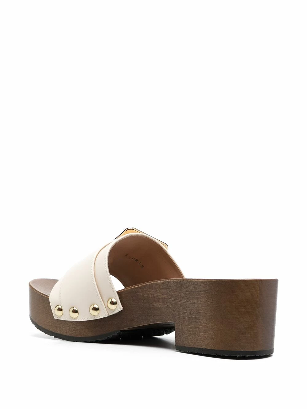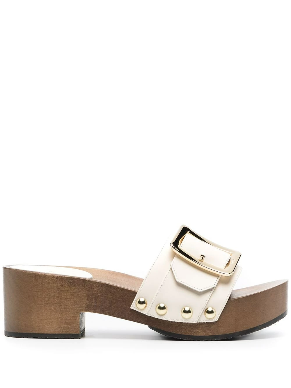 Bout ouvert, bride à un doigt, fermeture à boucles sur les côtés, semelle intérieure à logo, talon mi-haut.
