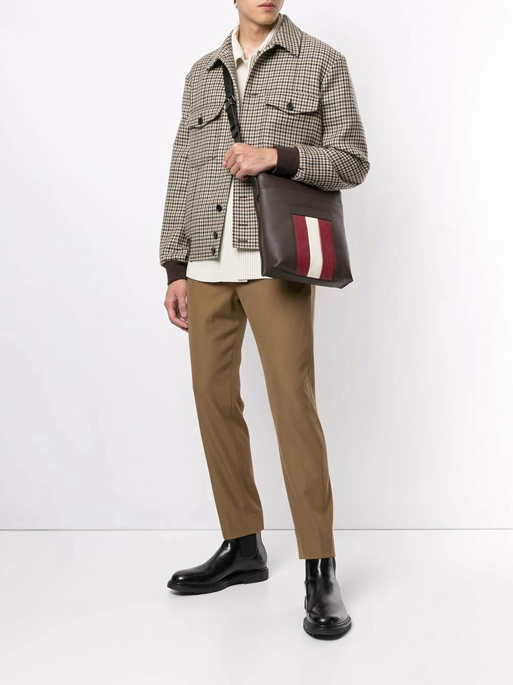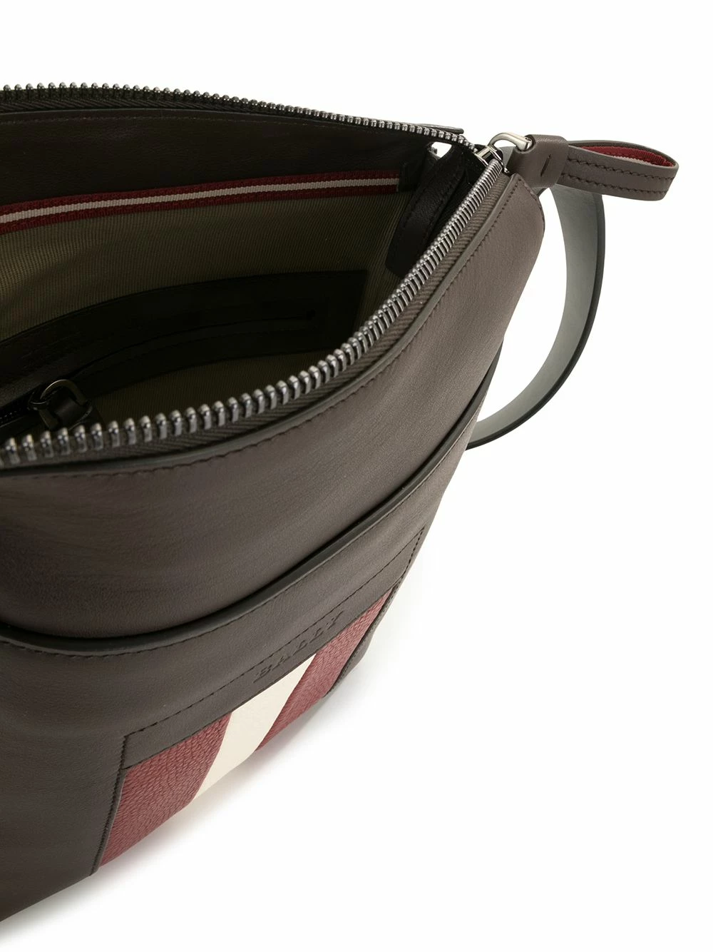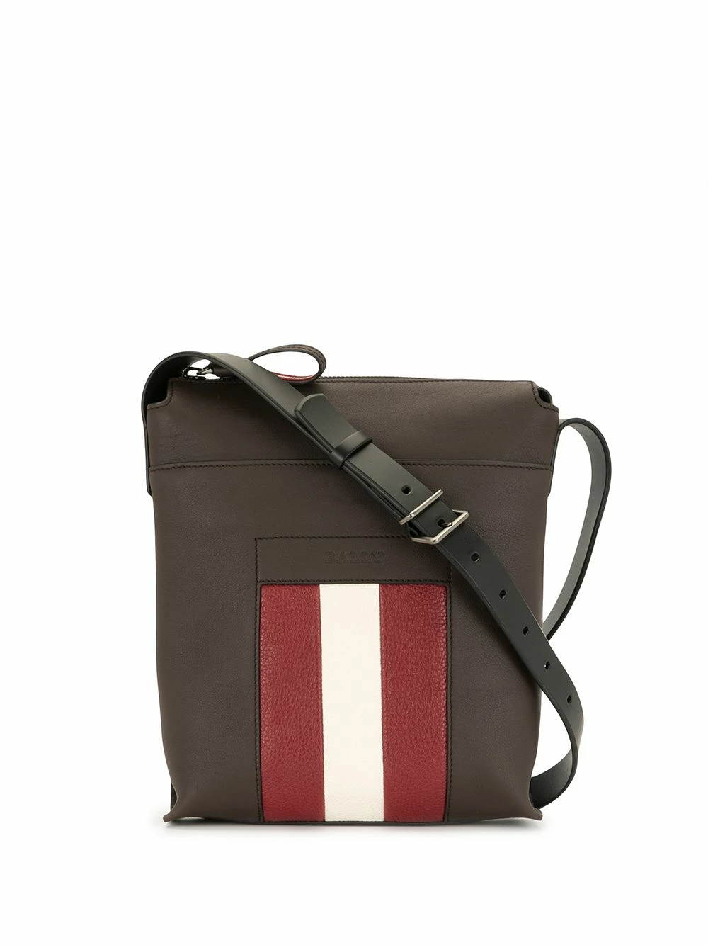 Rayures vives, logo embossé, fermeture zippée sur le dessus, bride portée épaule ajustable. Couleur : marron. Matière : cuir.