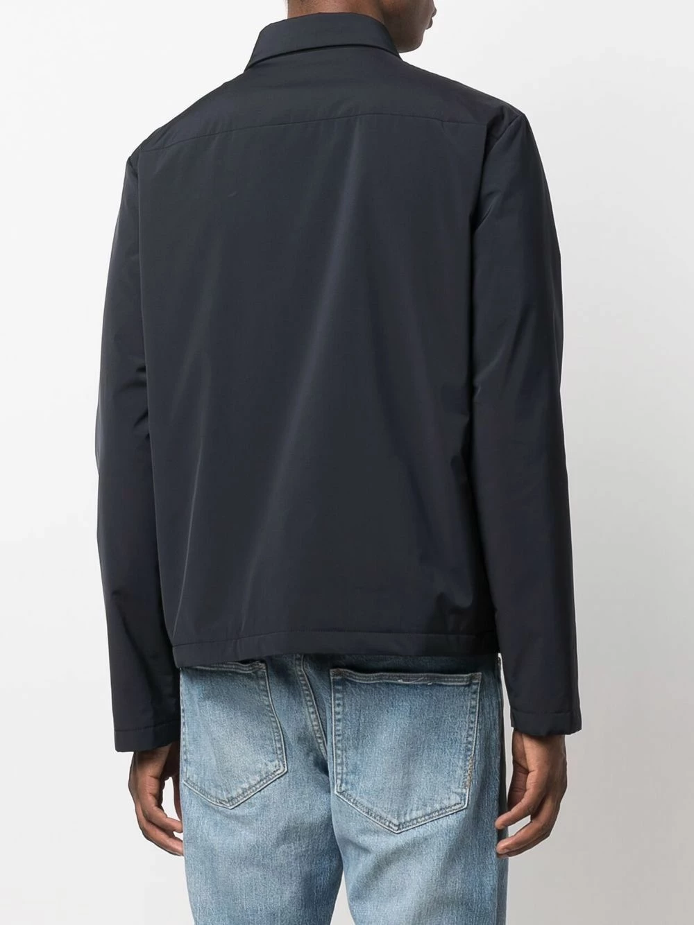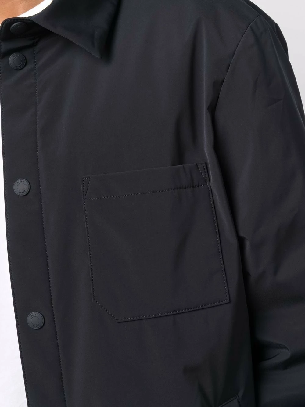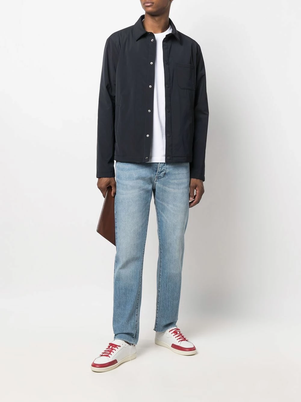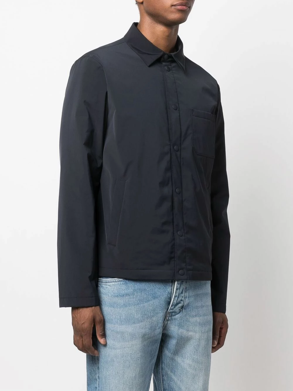 Col classique, fermeture à boutons pression, manches longues, deux poches passepoilées latérales.