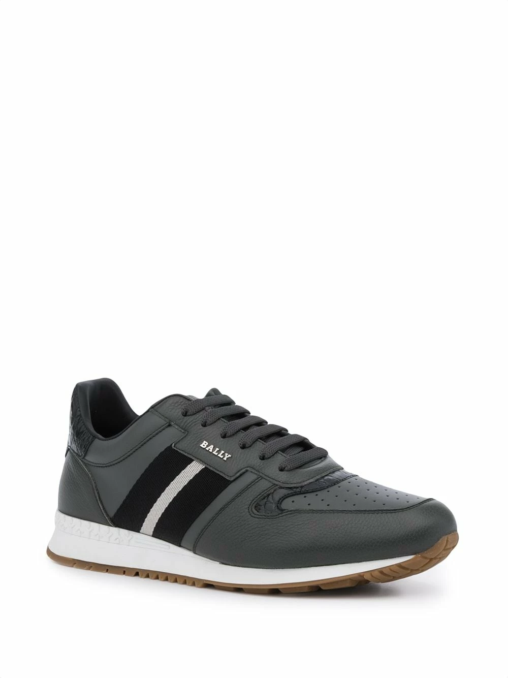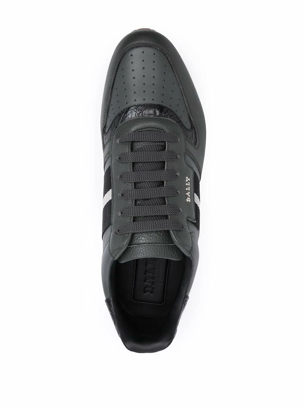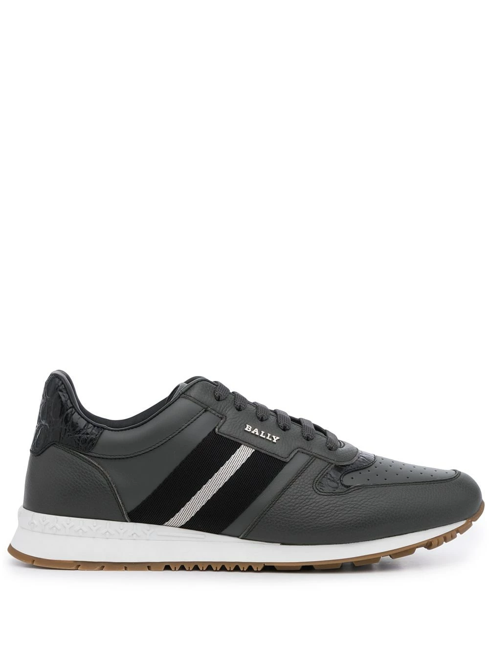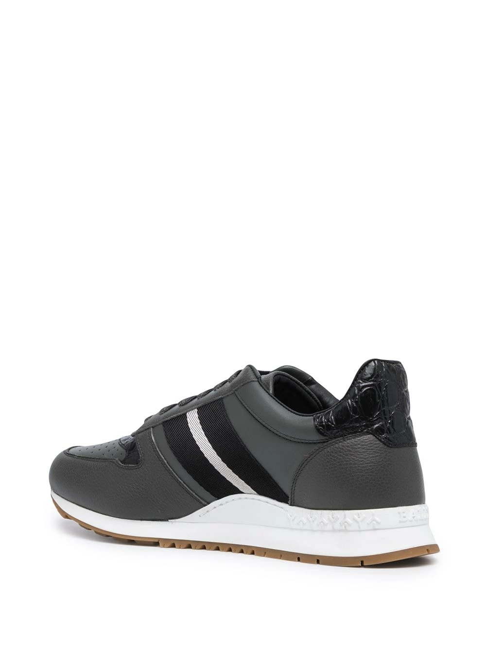 Texture grainée, logo argenté, détails rayés, effet peau de crocodile, détails de perforations, semelle intérieure à logo, fermeture à lacer sur le devant, semelle crantée en caoutchouc. Matière : cuir.