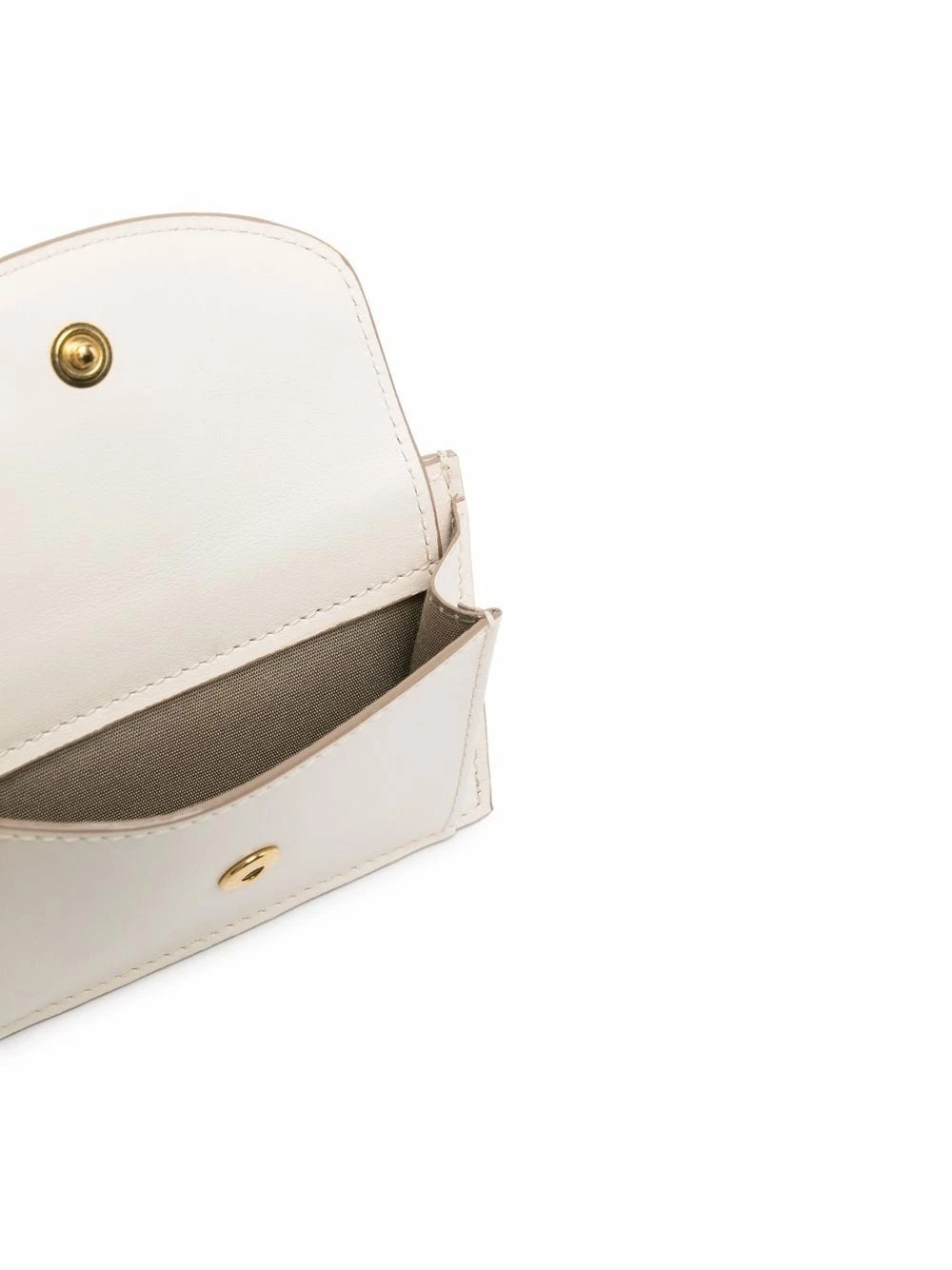 Plaque logo dorée, dessus à rabat avec bouton pression, fentes pour cartes à l’arrière. Matière : cuir.