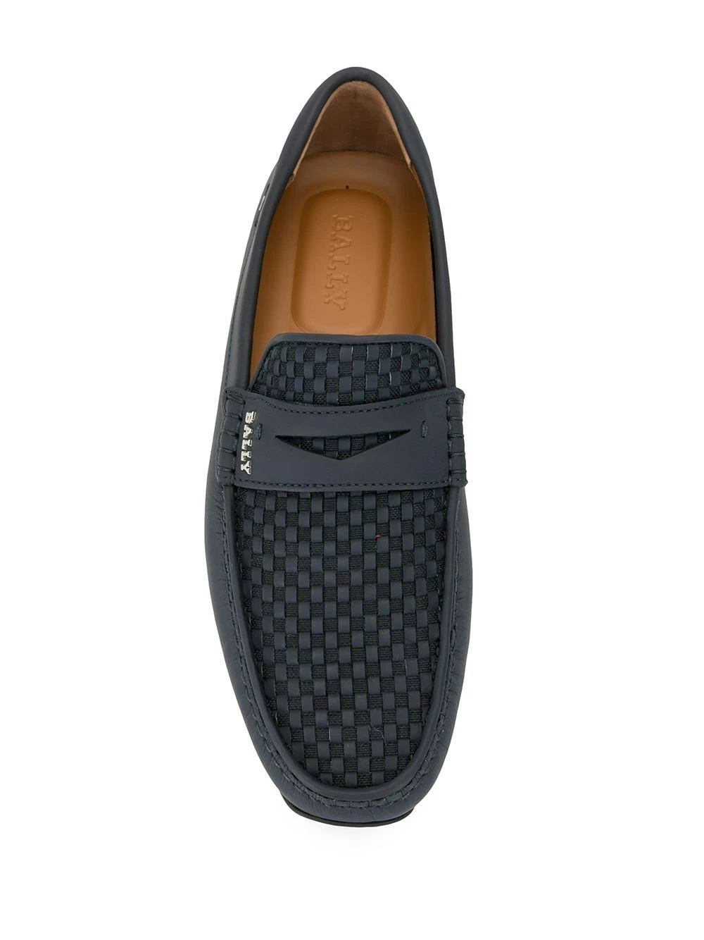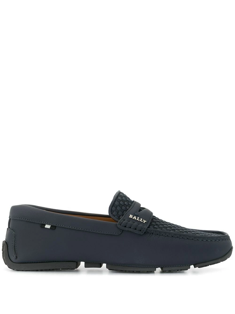 Mocassins à détail tissé en cuir Bally avec semelle plate en caoutchouc, semelle intérieure à logo, bout en amande et design à enfiler. Couleur : bleu.