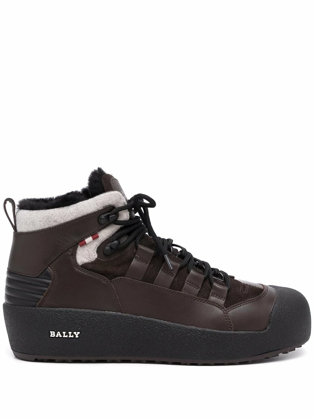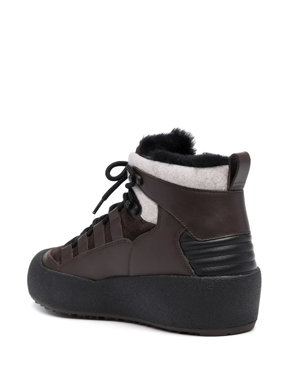 Languette à logo imprimé, doublure en fourrure artificielle, bout rond, fermeture à lacer sur le devant, languette d’enfilage au talon, semelle en caoutchouc. Couleur : marron. Matière : cuir.