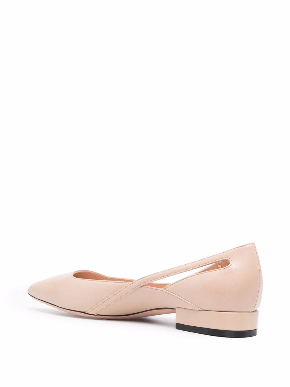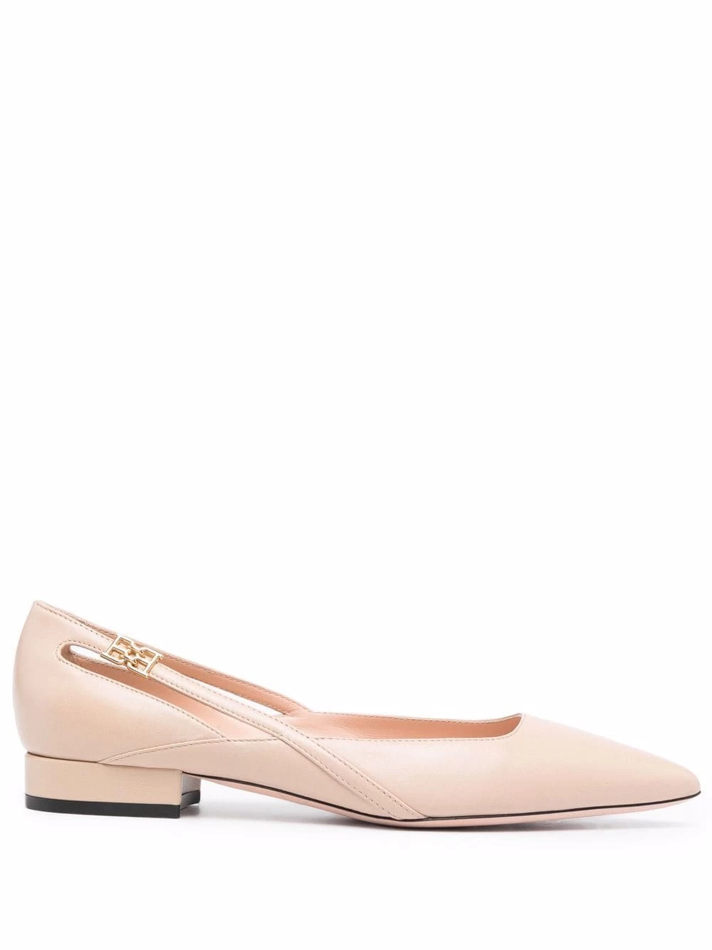 Breloque à logo, bout pointu, détails de découpes, petit talon épais. Matière : cuir.