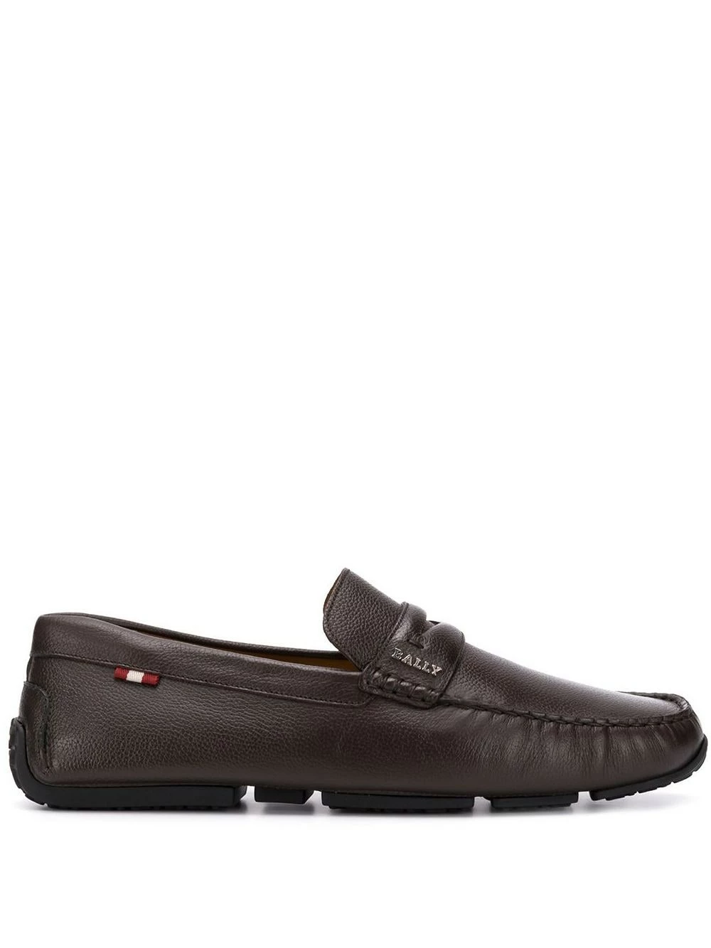 Mocassins classiques en cuir de veau Bally avec bout carré, a slip-on style, plaque logo argentée, semelle intérieure à logo et semelle crantée en caoutchouc. Couleur : marron.