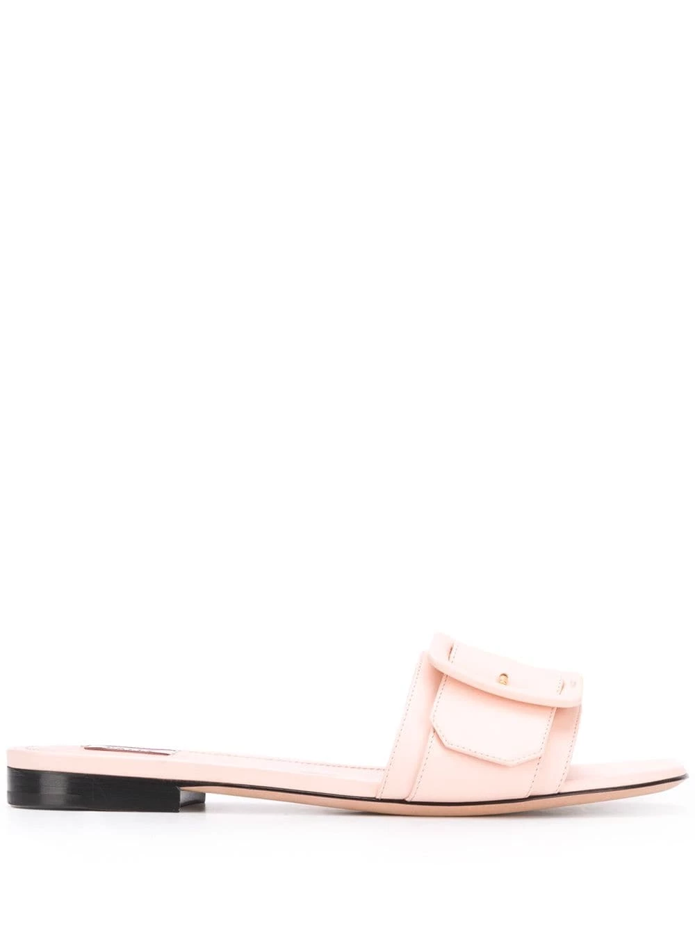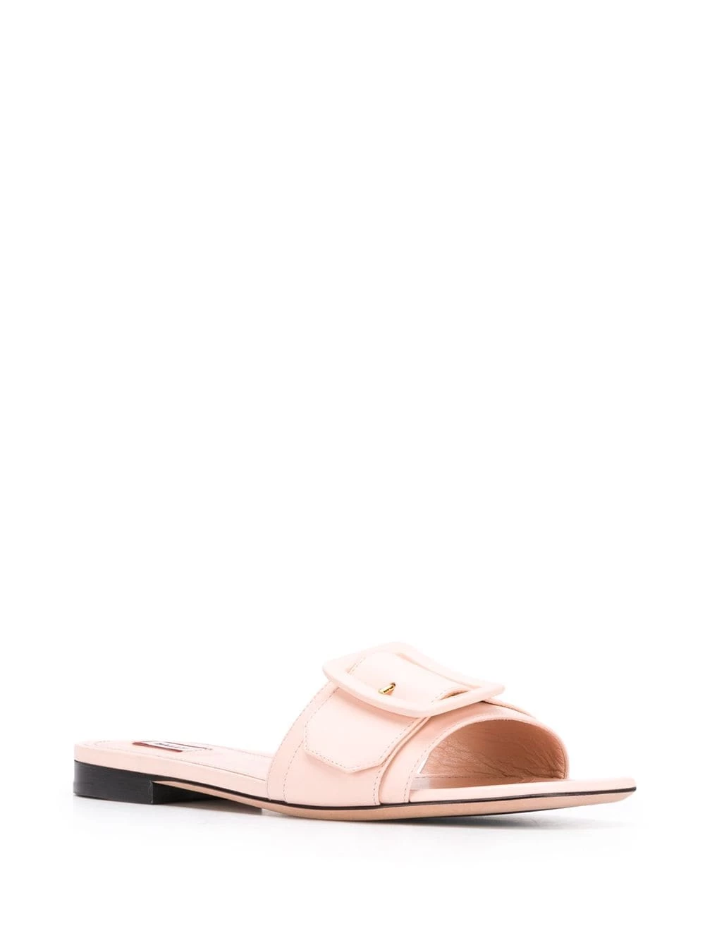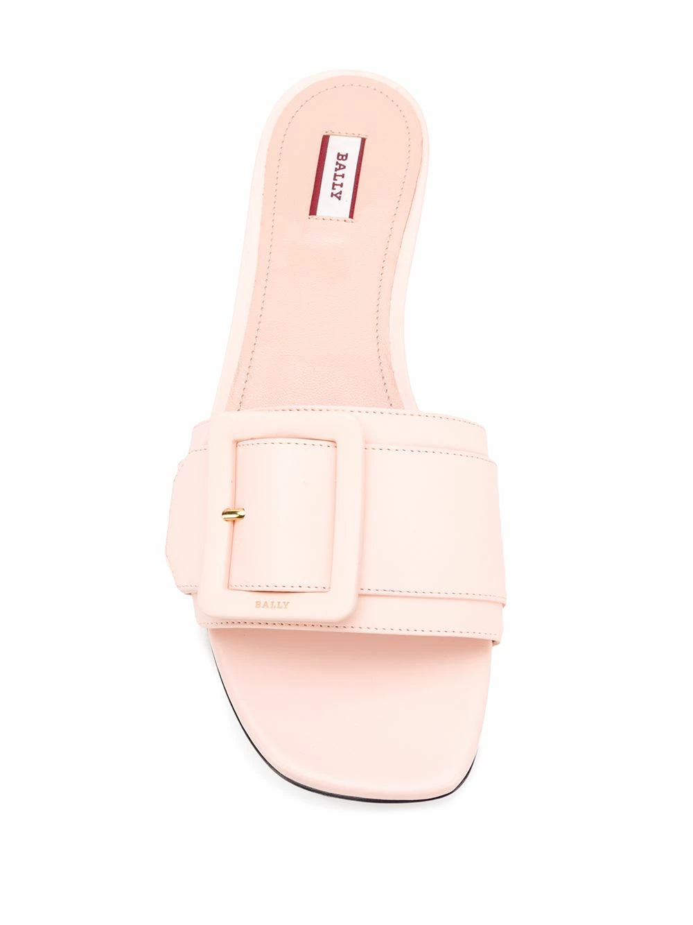 Sandales à boucle en cuir Bally avec bout ouvert, semelle intérieure à logo et semelle plate. Couleur : rose.