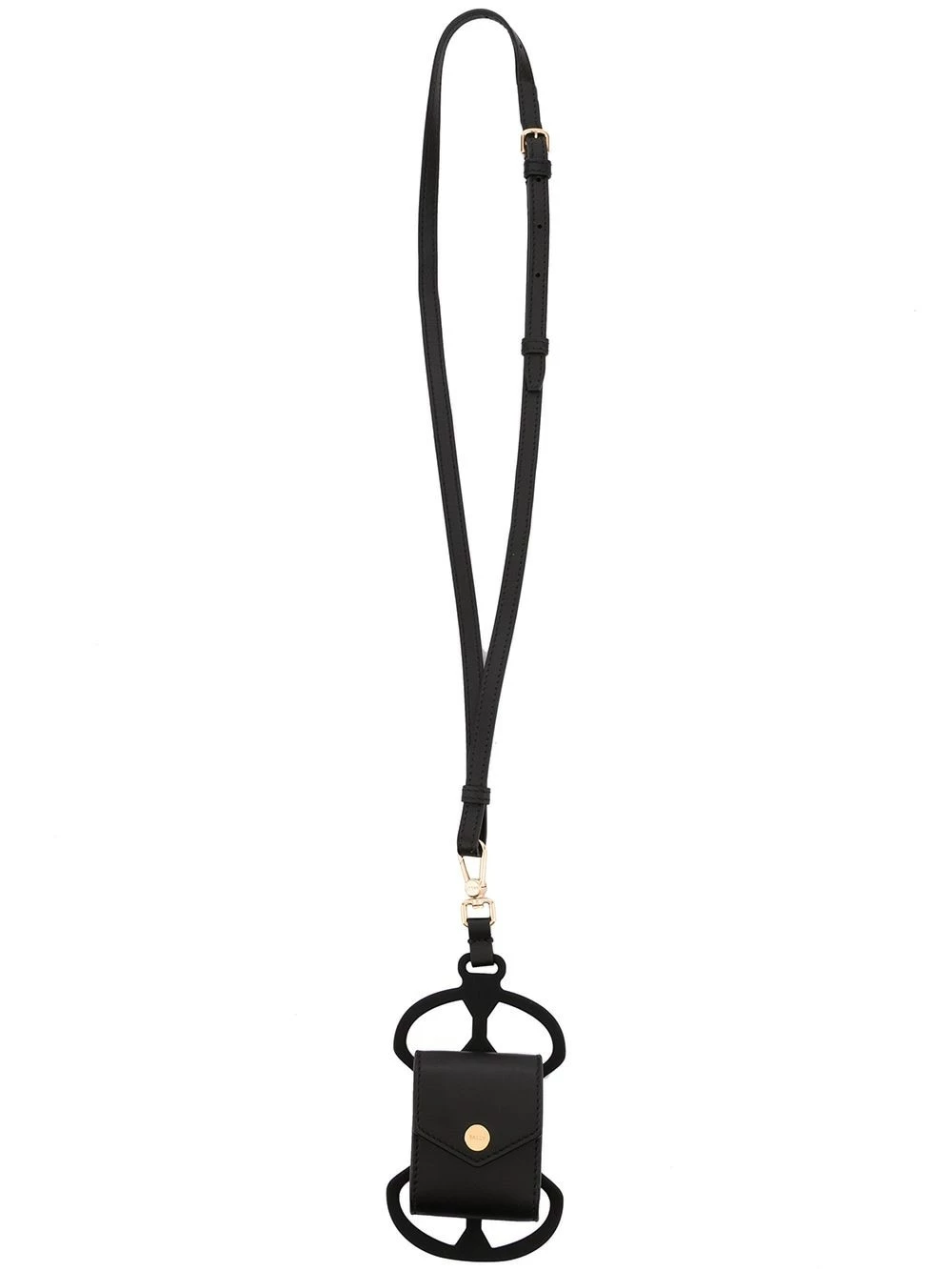 Logo embossé, finitions en métal doré, bride porté autour du cou détachable, dessus à rabat avec bouton pression, compartiment principal. Couleur : noir. Matière : cuir.