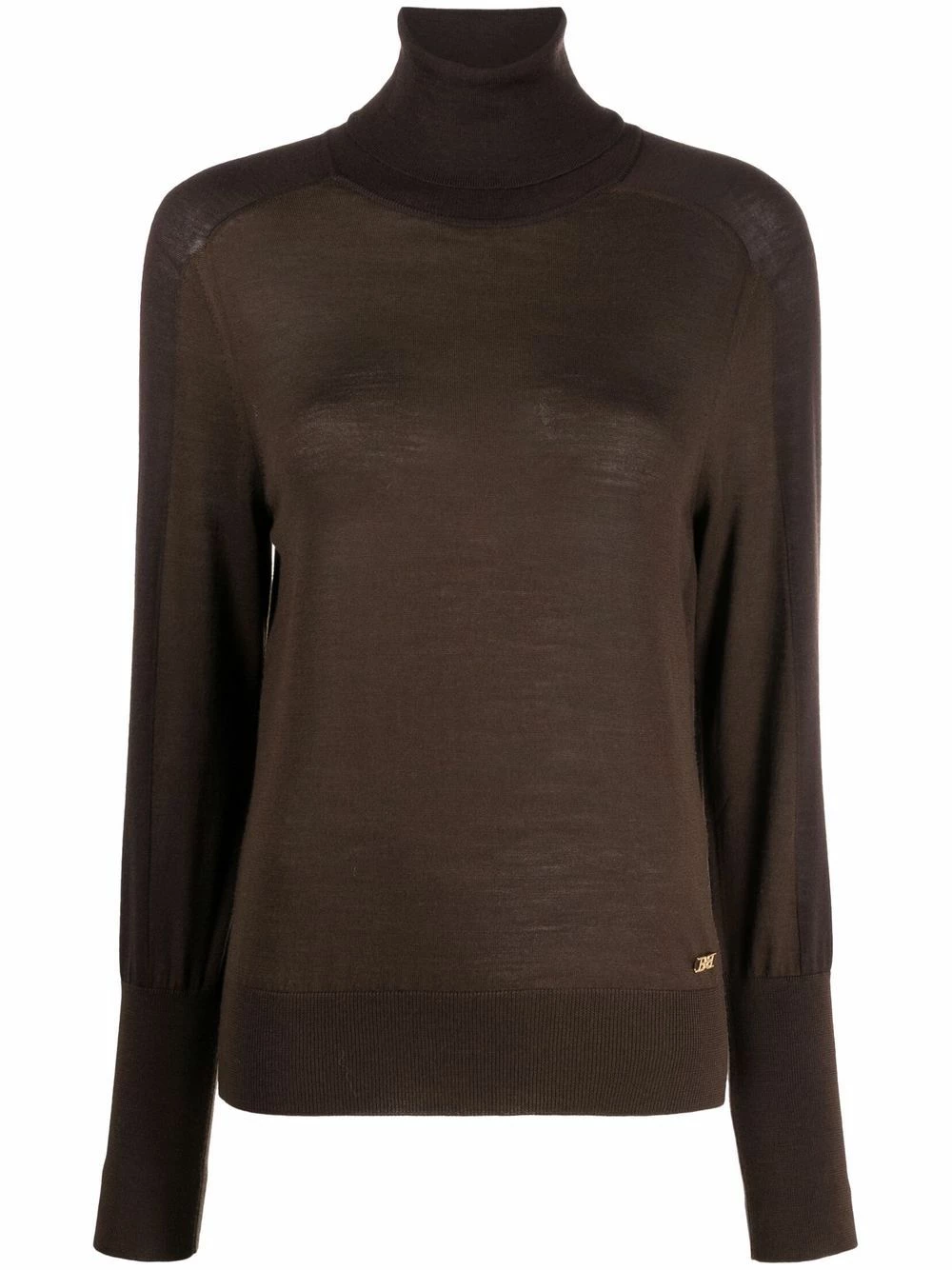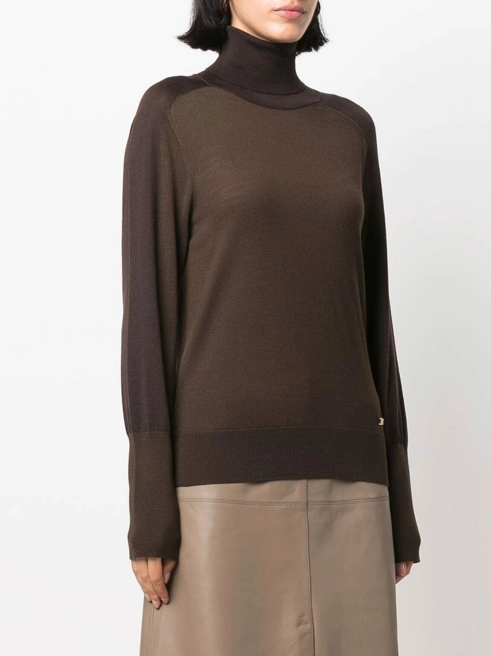 Détail nervuré, plaque logo dorée, col roulé, manches longues, ourlet droit. Matière : mérinos.