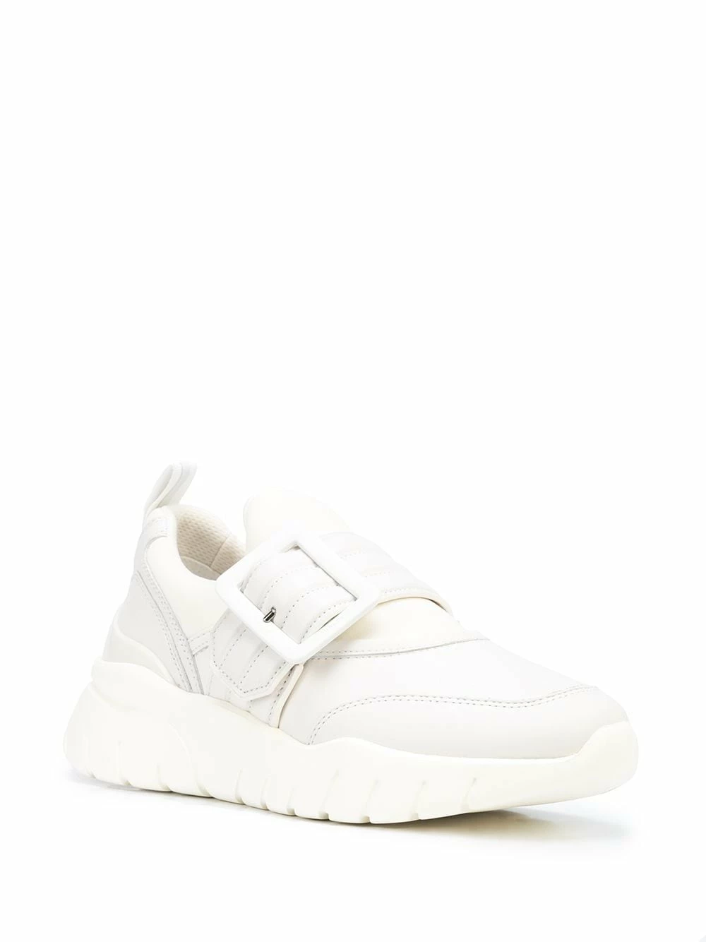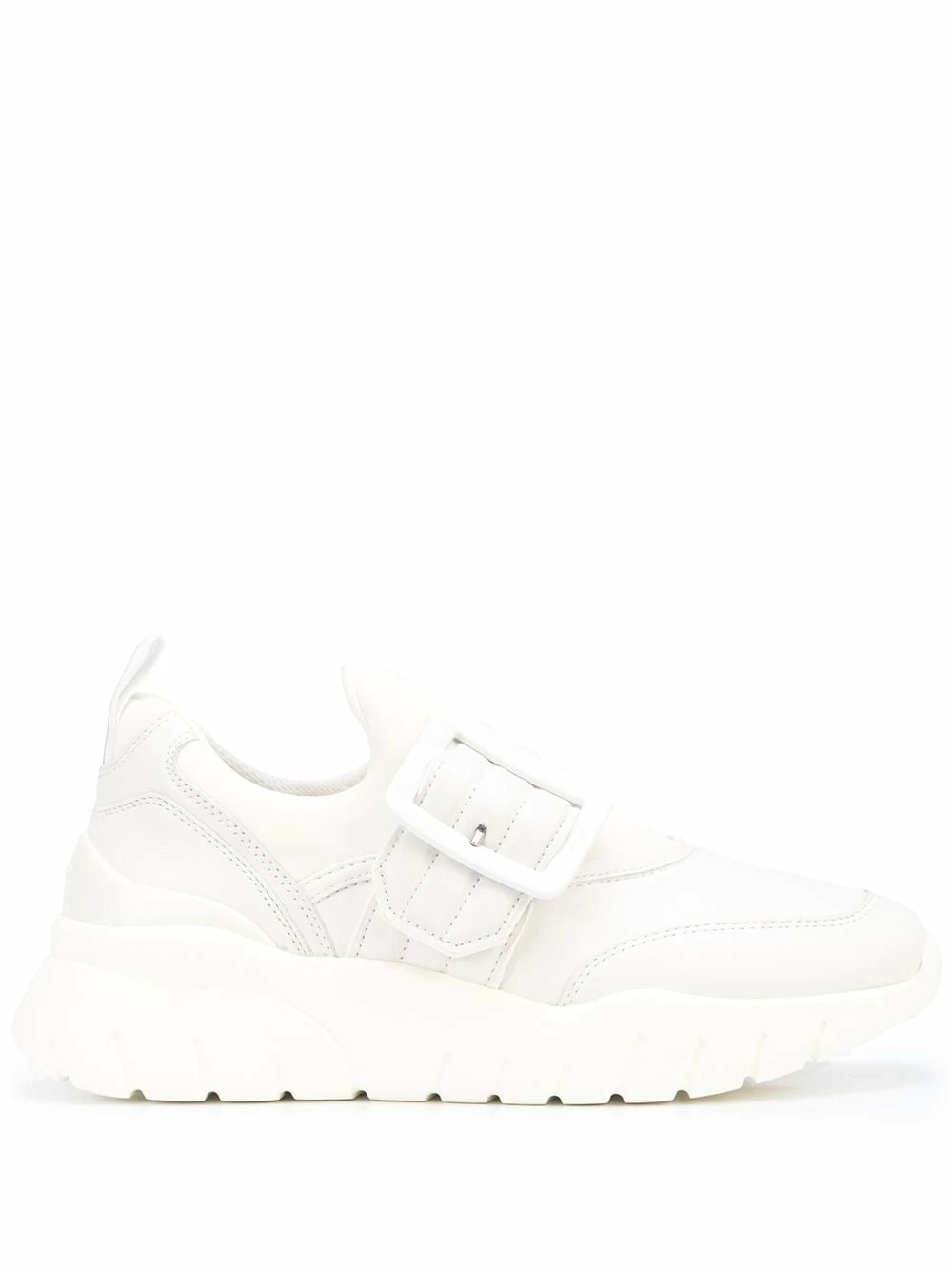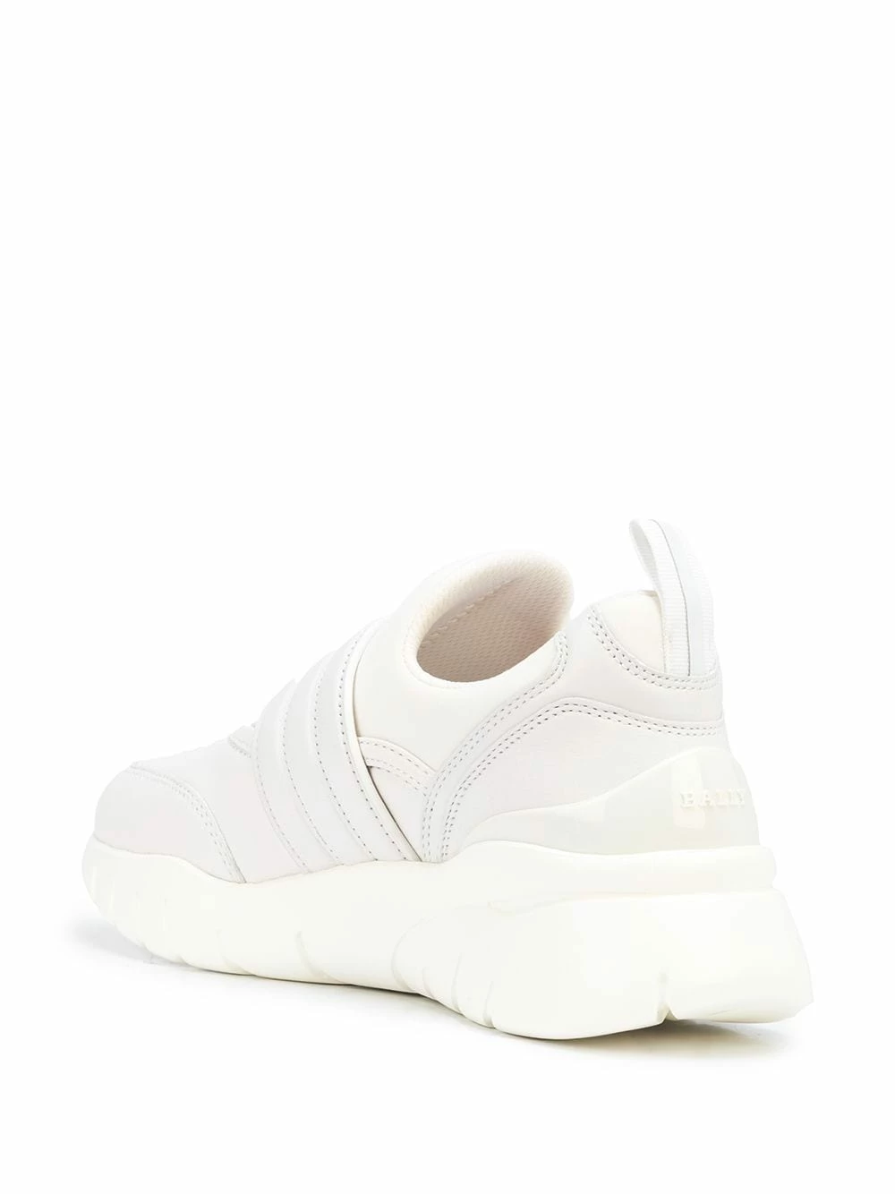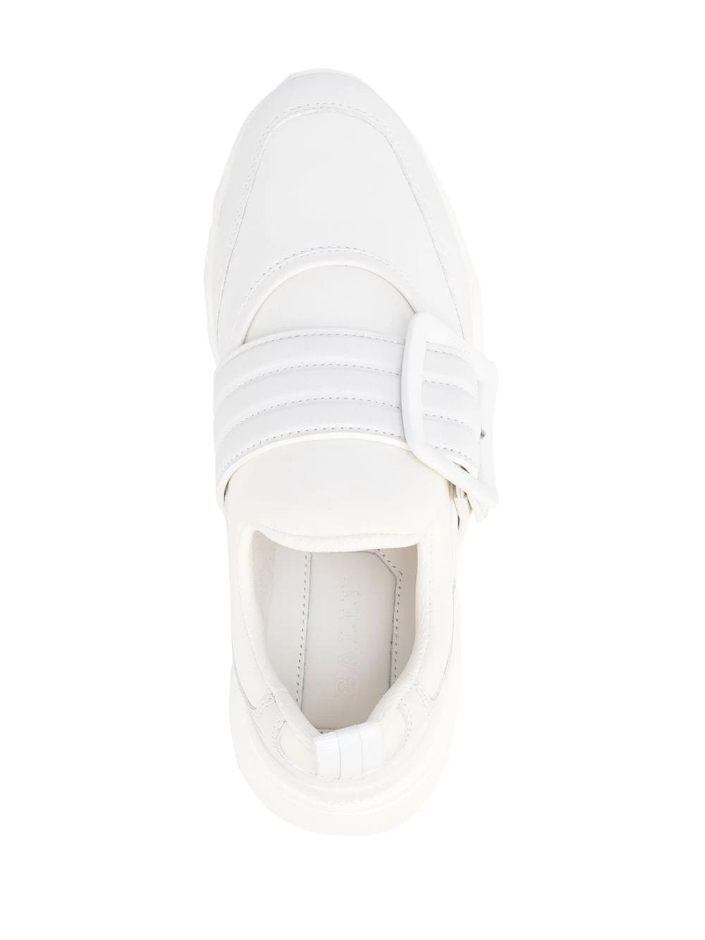Fini texturé, fermeture à boucle, bout en amande, languette d’enfilage au talon, semelle épaisse en caoutchouc. Couleur : blanc. Matière : cuir de veau.