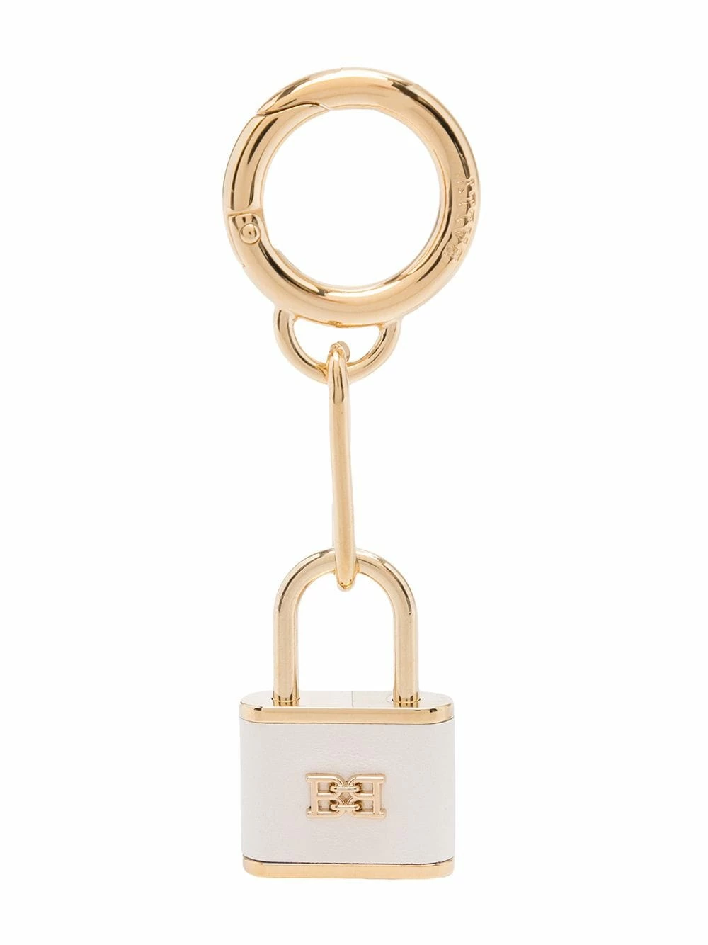Détail de cadenas, plaque logo, attache porte-clés. Matière : cuir de veau.