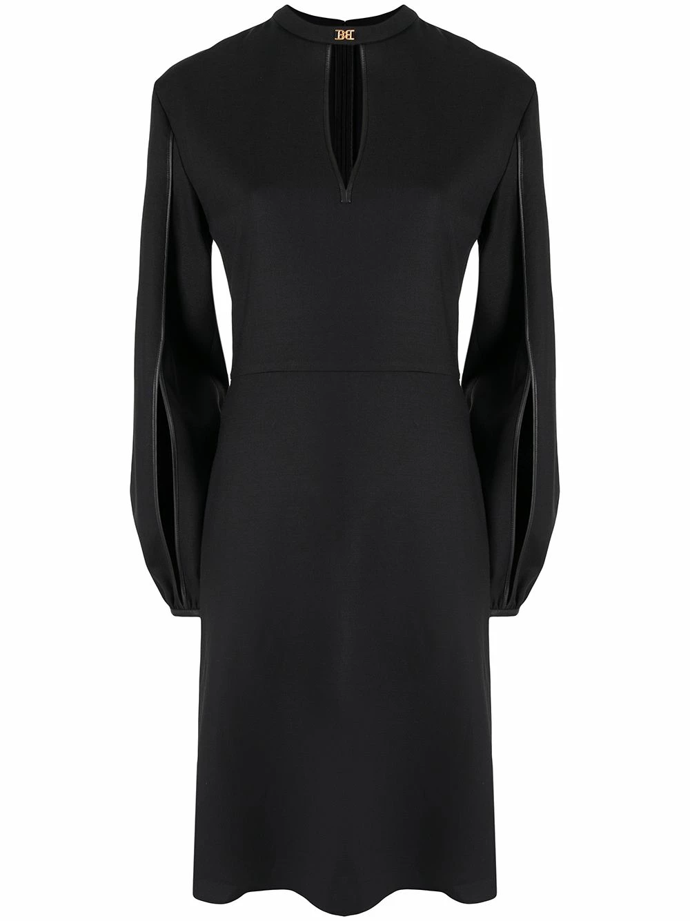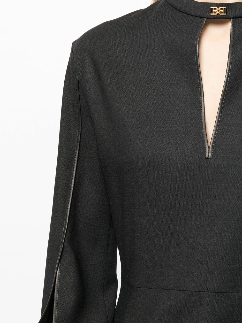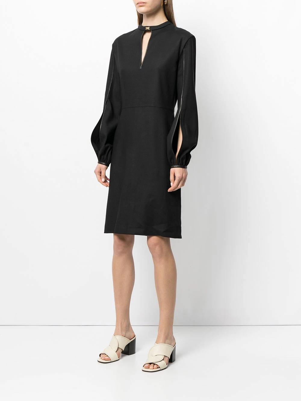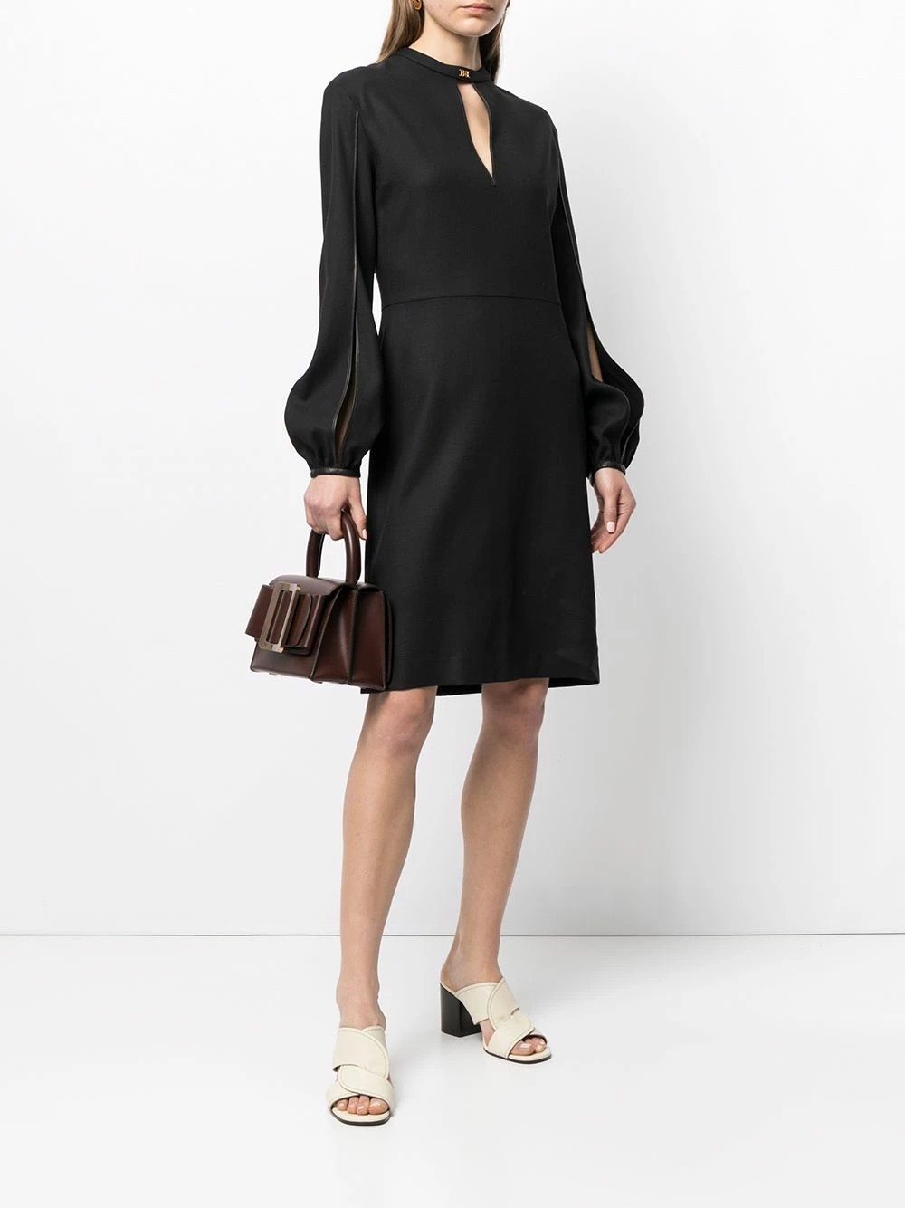 Col à ouverture goutte d’eau, manches longues, fermeture zippée dissimulée à l’arrière, finitions en métal doré. Couleur : Noir.