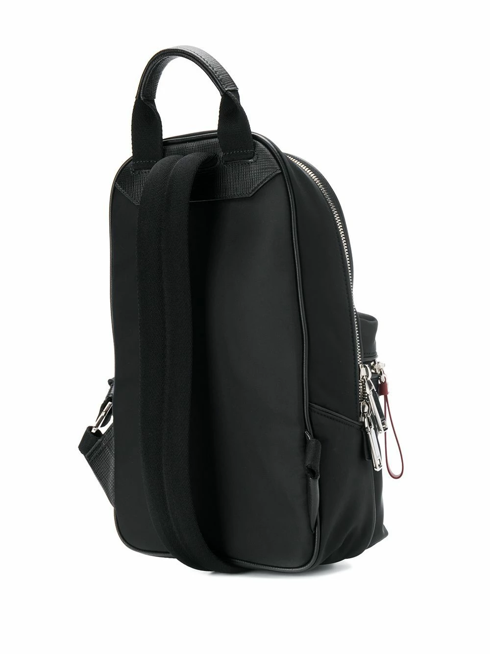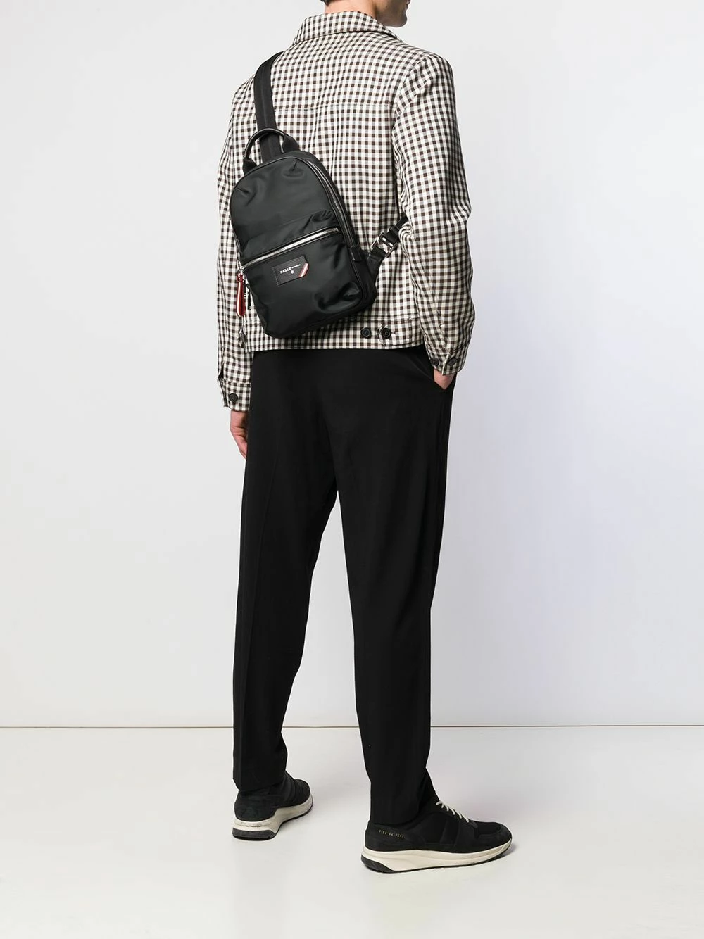 Sac à dos Fuston Bally avec anse arrondie, fermeture zippée tout autour, compartiment zippé sur le devant, doublure monogrammée et patch logo sur le devant. Couleur : noir.