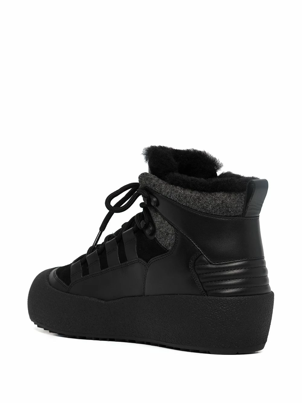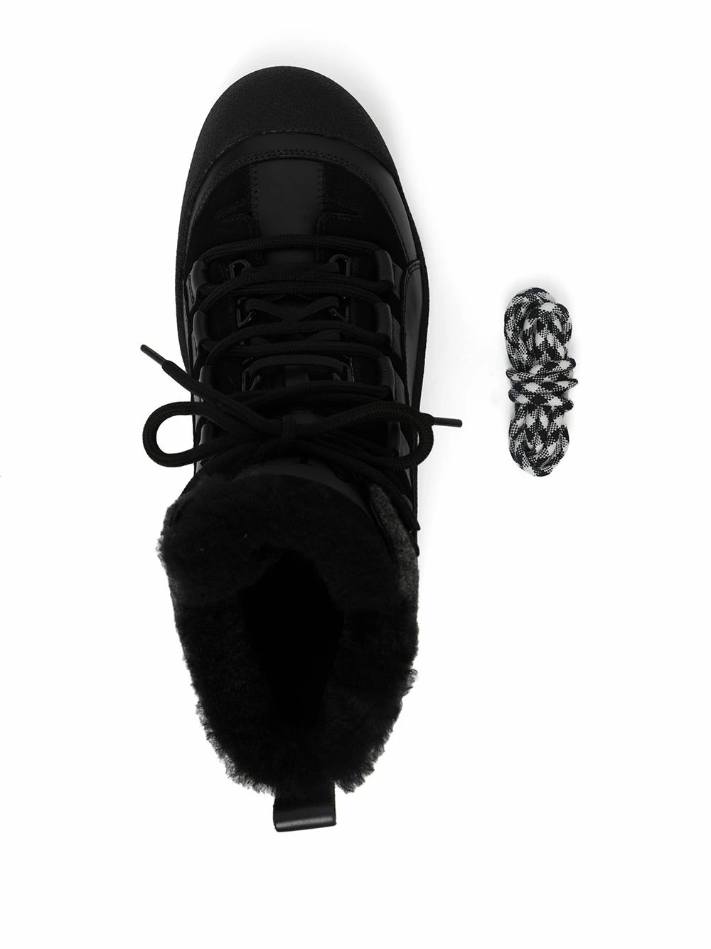 Design à empiècements, logo lettre, bout rond, fermeture à lacer sur le devant, languette à patch logo, hauteur cheville, languette d’enfilage au talon, semelle épaisse en caoutchouc, doublure en fourrure artificielle. Couleur : noir. Matière : cuir.