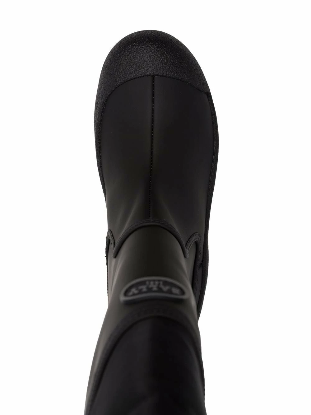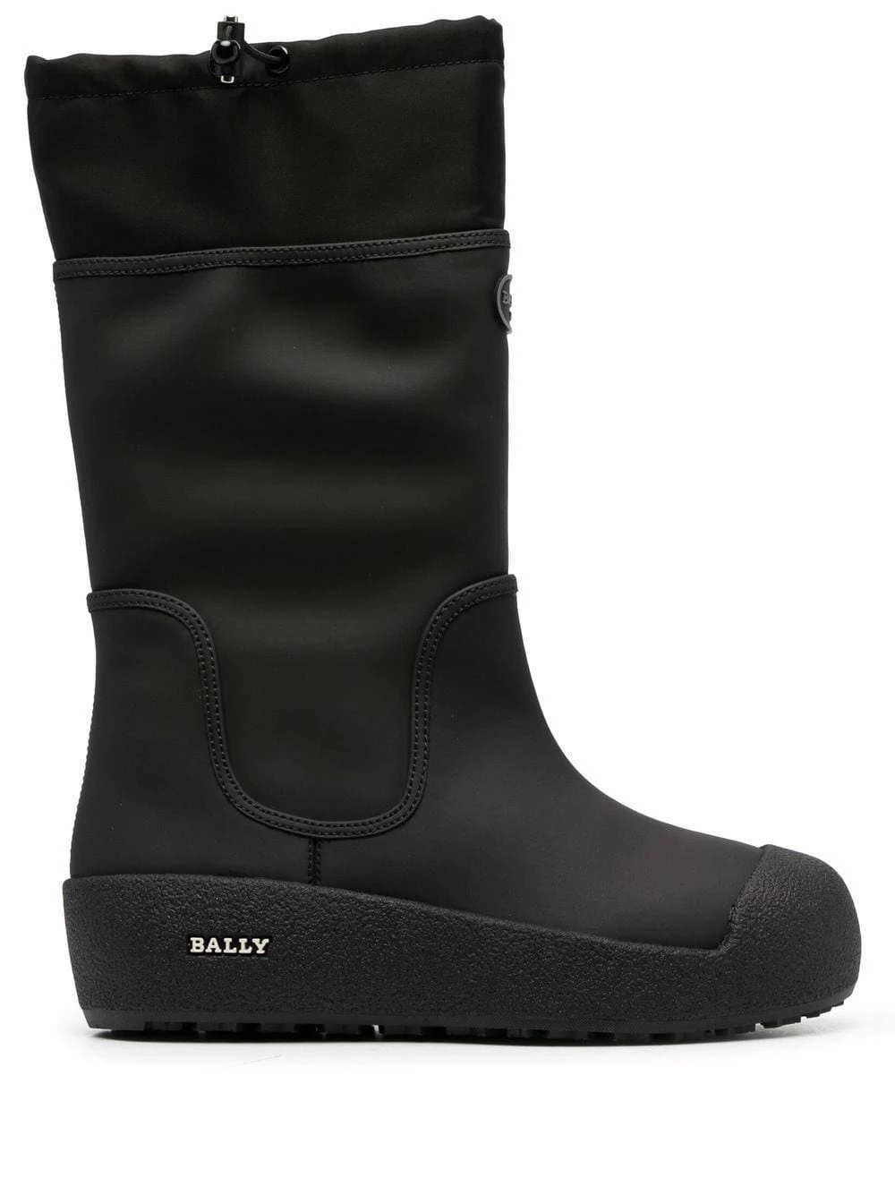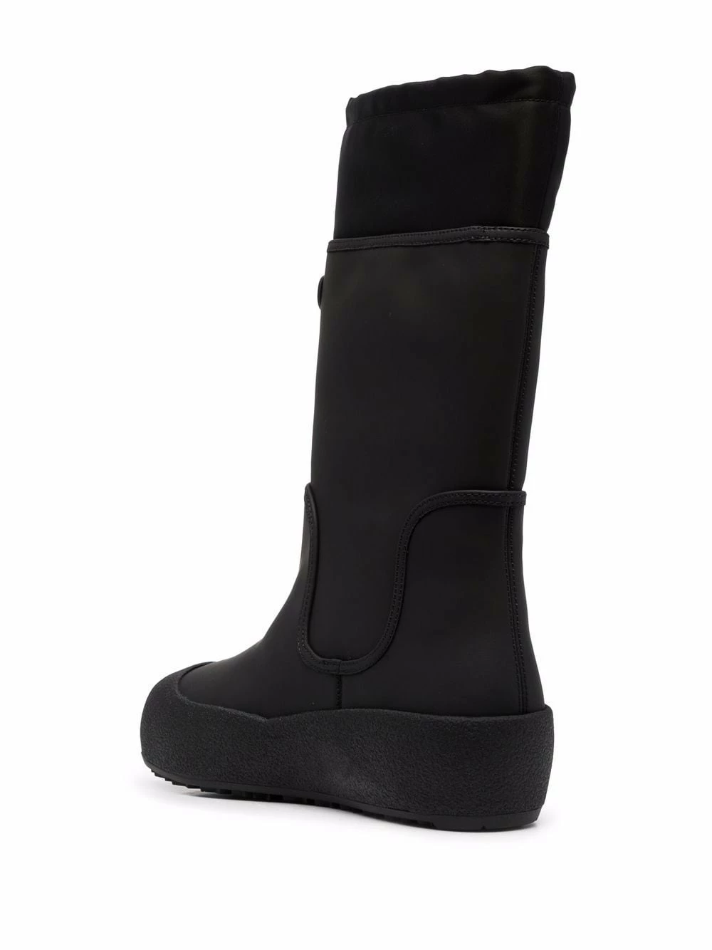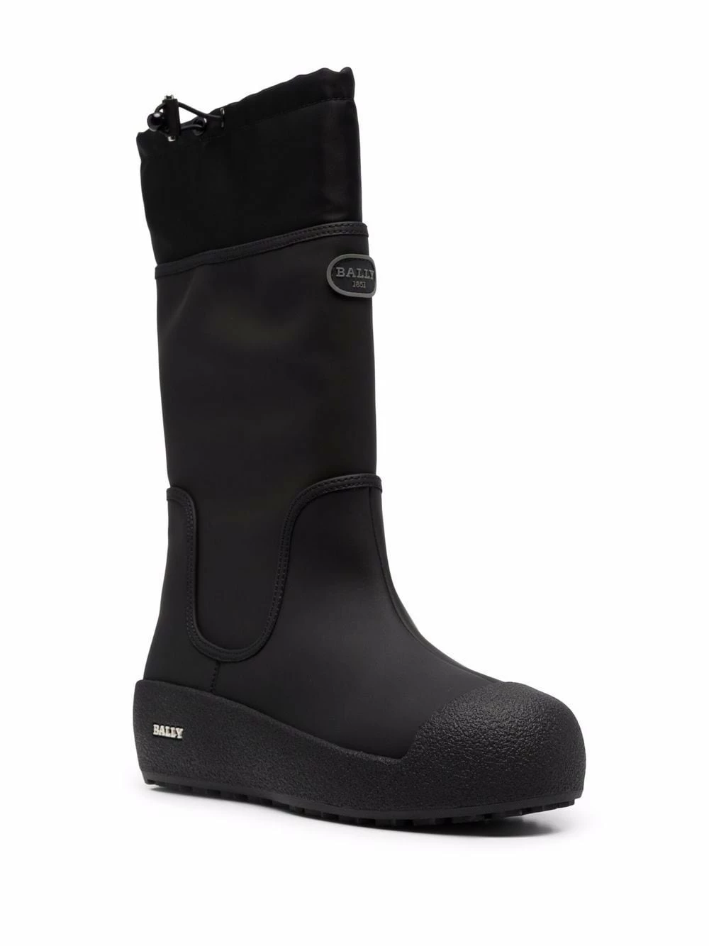 Noir, plaque logo, fermeture à lien de resserrage, hauteur genou, bout rond, semelle à plateforme.