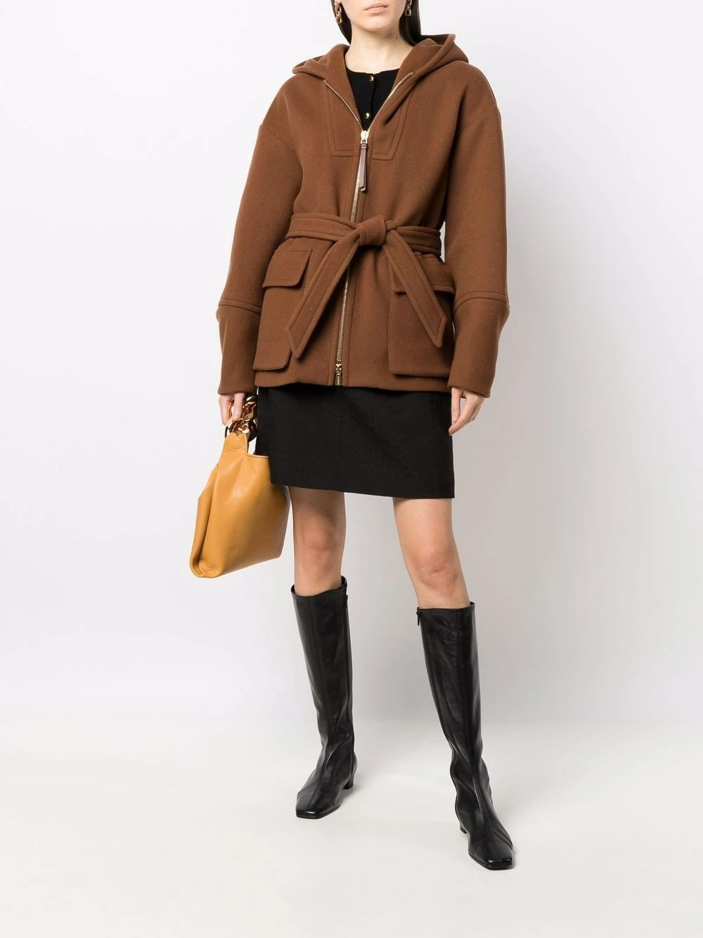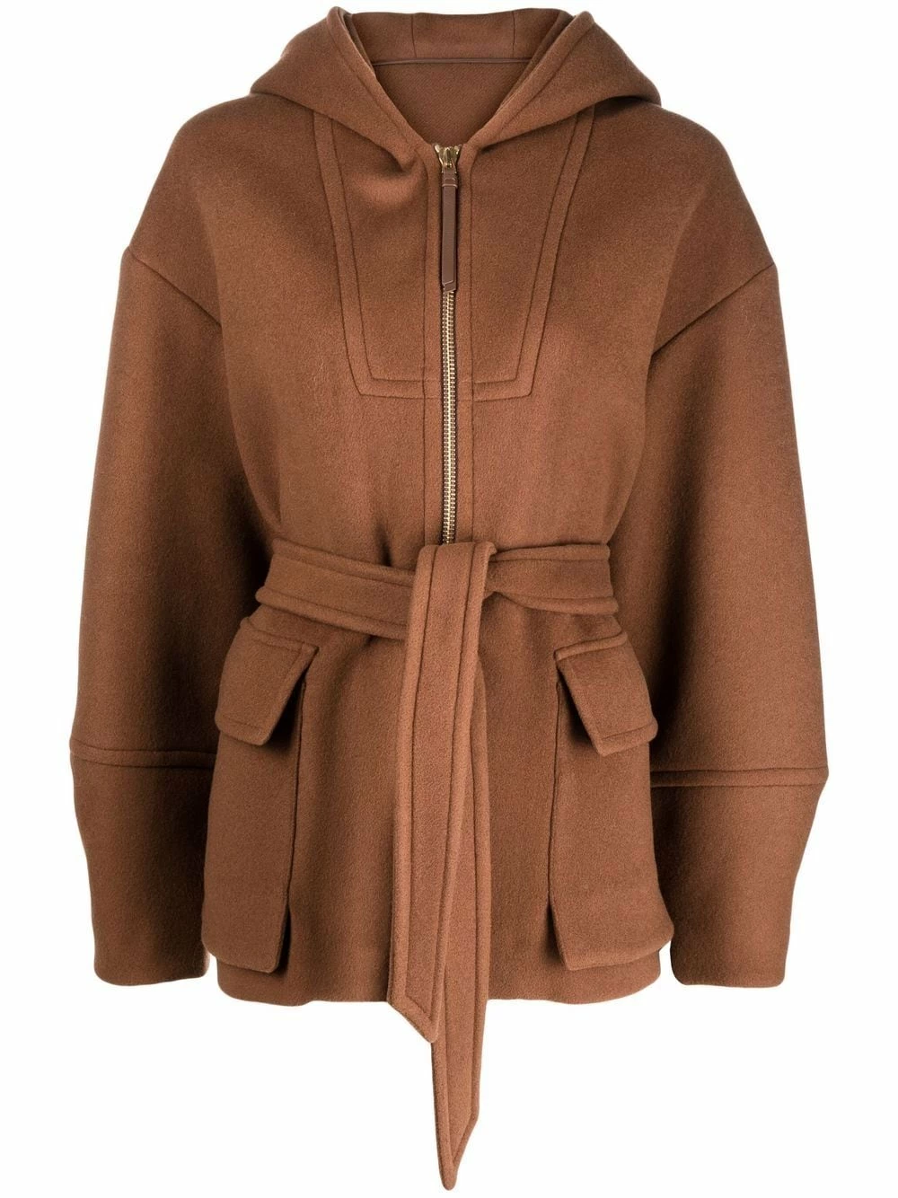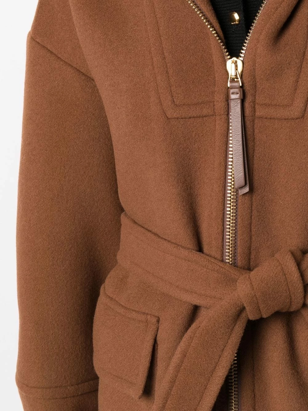 Capuche classique, fermeture zippée devant, finitions en métal doré, manches longues, taille ceinturée, deux poches à rabat sur le devant.