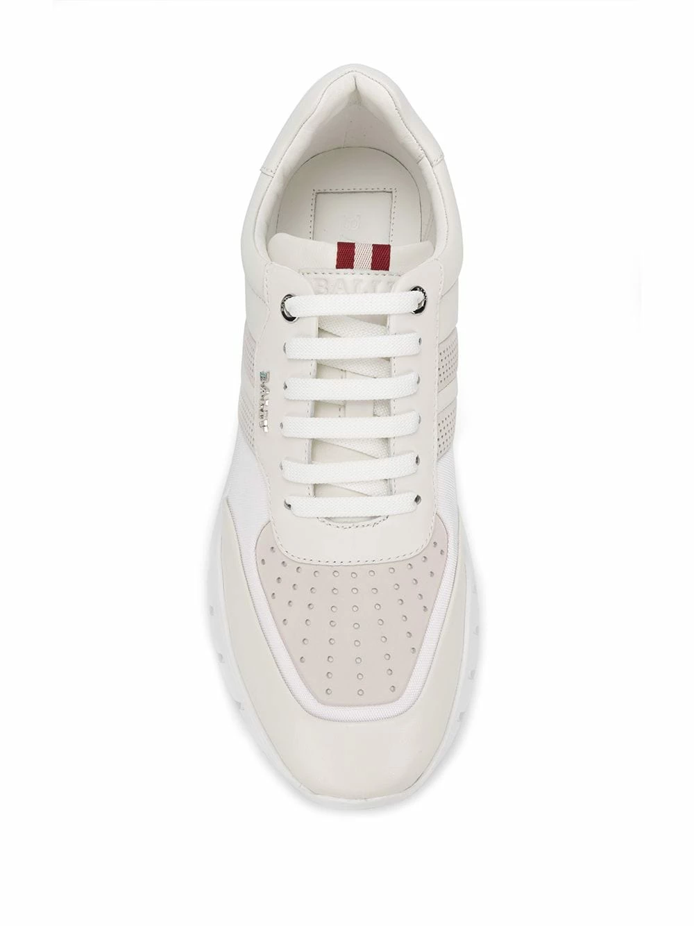 Baskets à bandes contrastantes en cuir Bally avec fermeture à lacer sur le devant, patch logo sur la languette, détail de perforation, fermeture à lacer sur le devant, bout rond et semelle en caoutchouc blanc. Couleur : blanc.