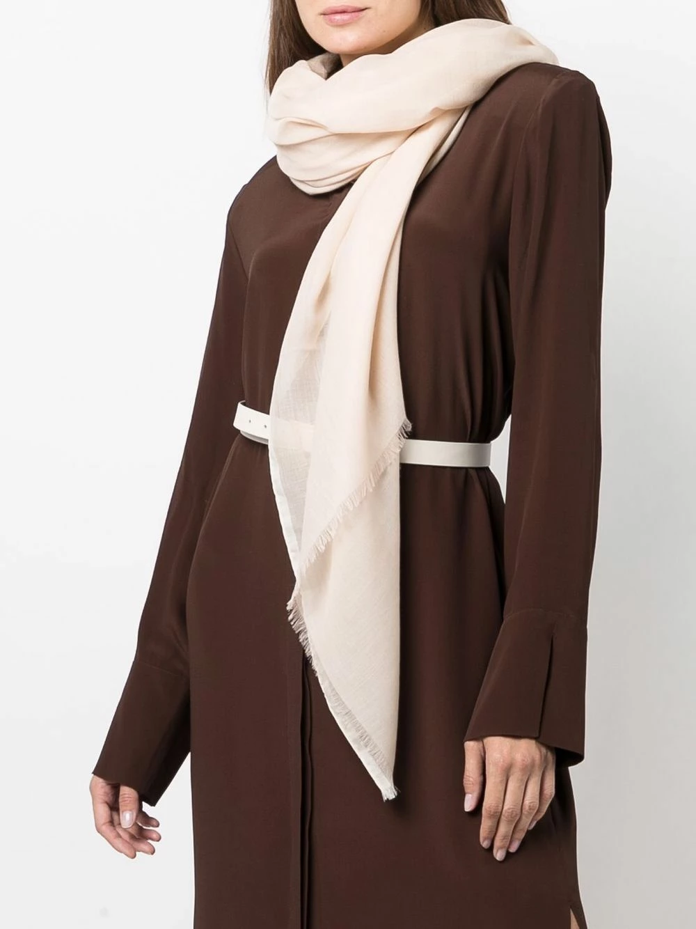 Design tricoté, logo brodé sur le devant, bord rayé, finition à franges. Couleur : rose.
