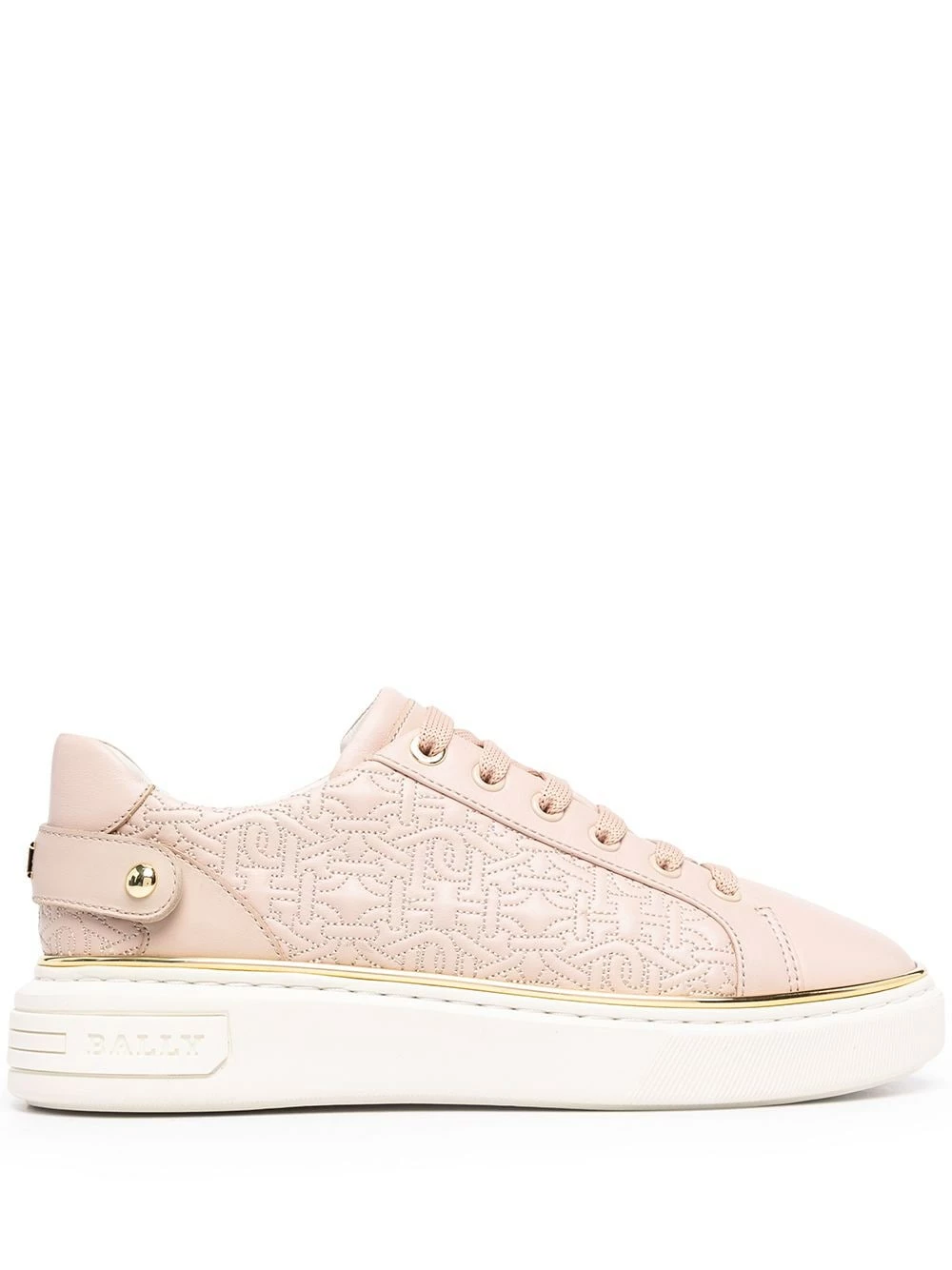 Plaque logo dorée, languette à patch logo, motif monogrammé, bout rond, fermeture à lacer sur le devant, semelle intérieure à logo, semelle plate en caoutchouc. Couleur : rose. Matière : cuir.