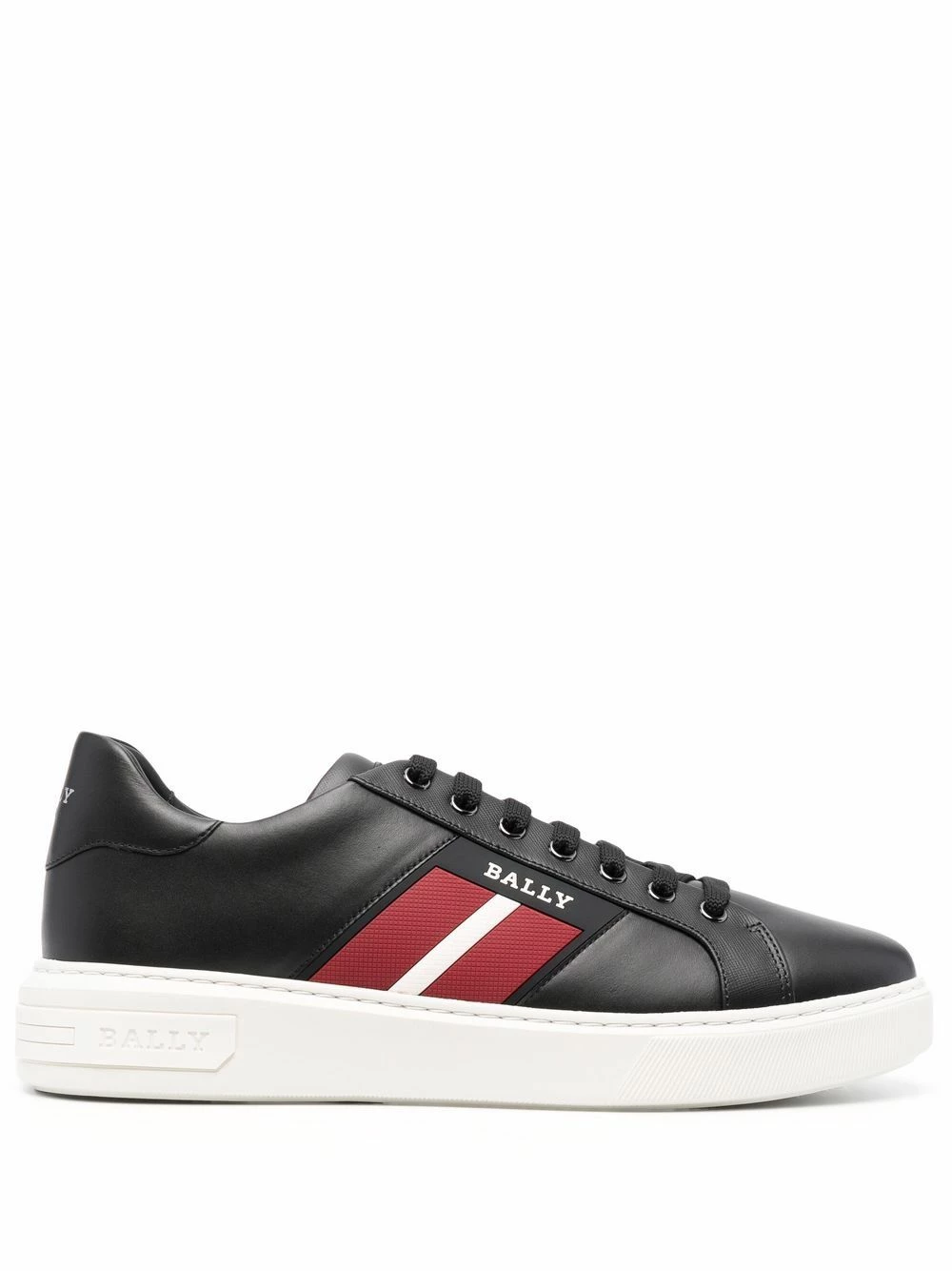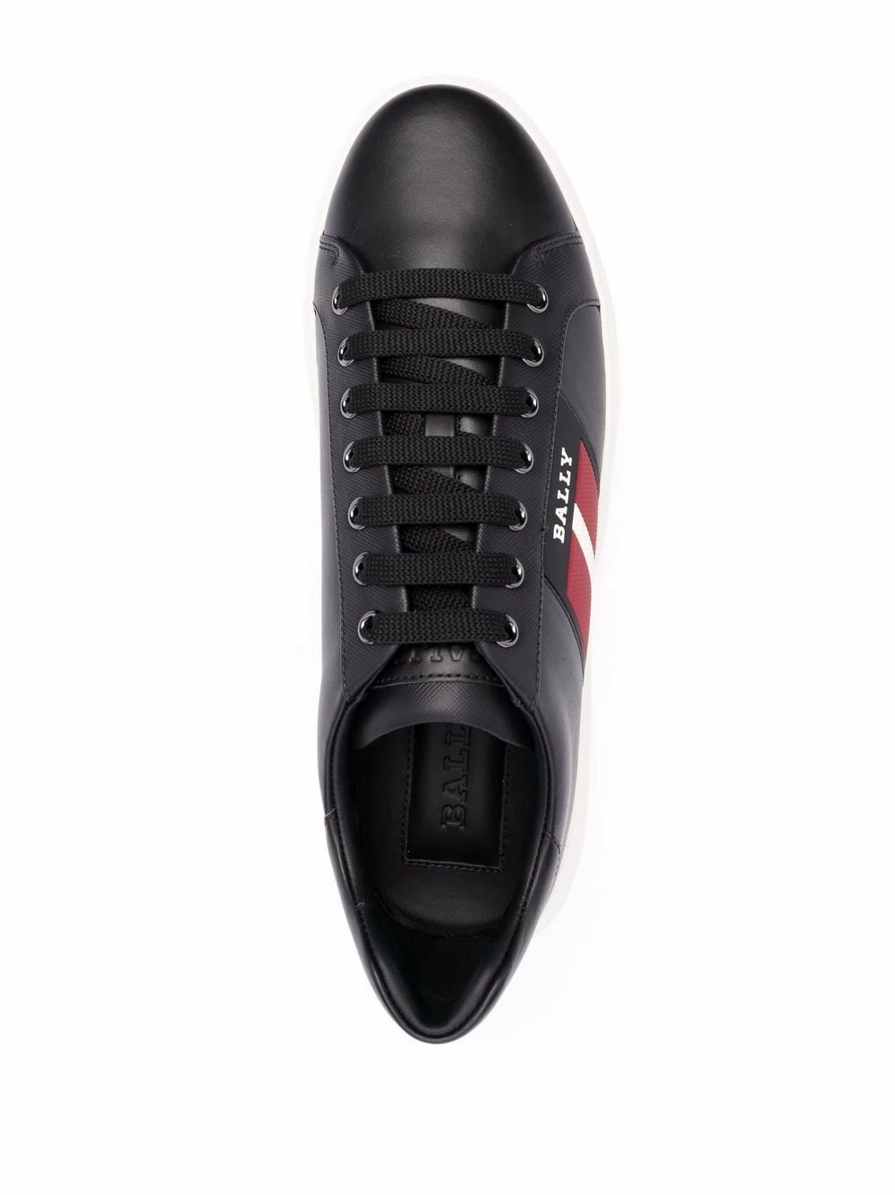 Détail de rayure latérale, languette à logo embossé, bout rond, fermeture à lacer sur le devant, semelle intérieure à logo, semelle plate en caoutchouc. Couleur : noir. Matière : cuir.