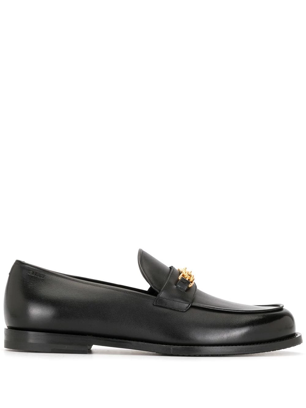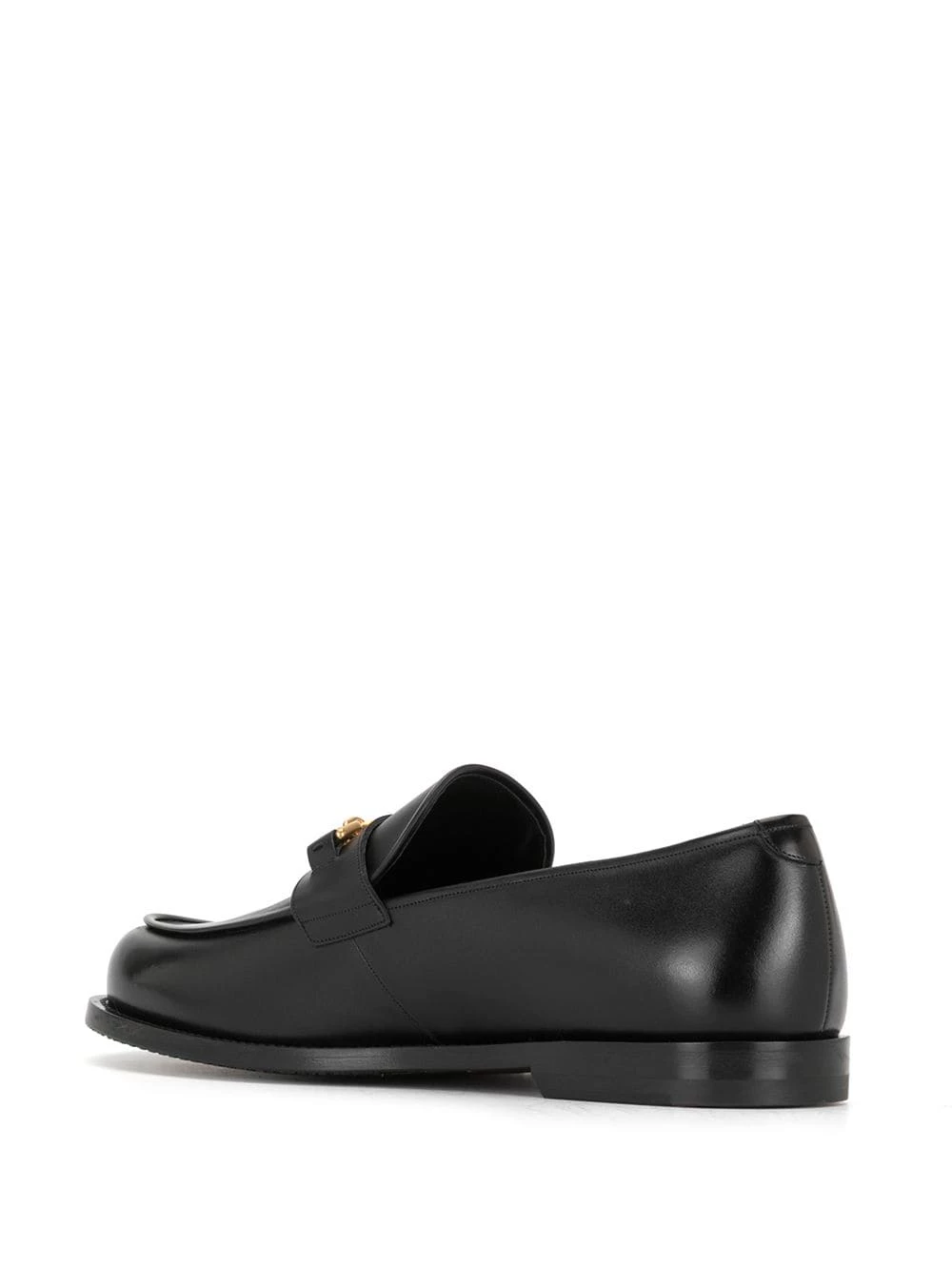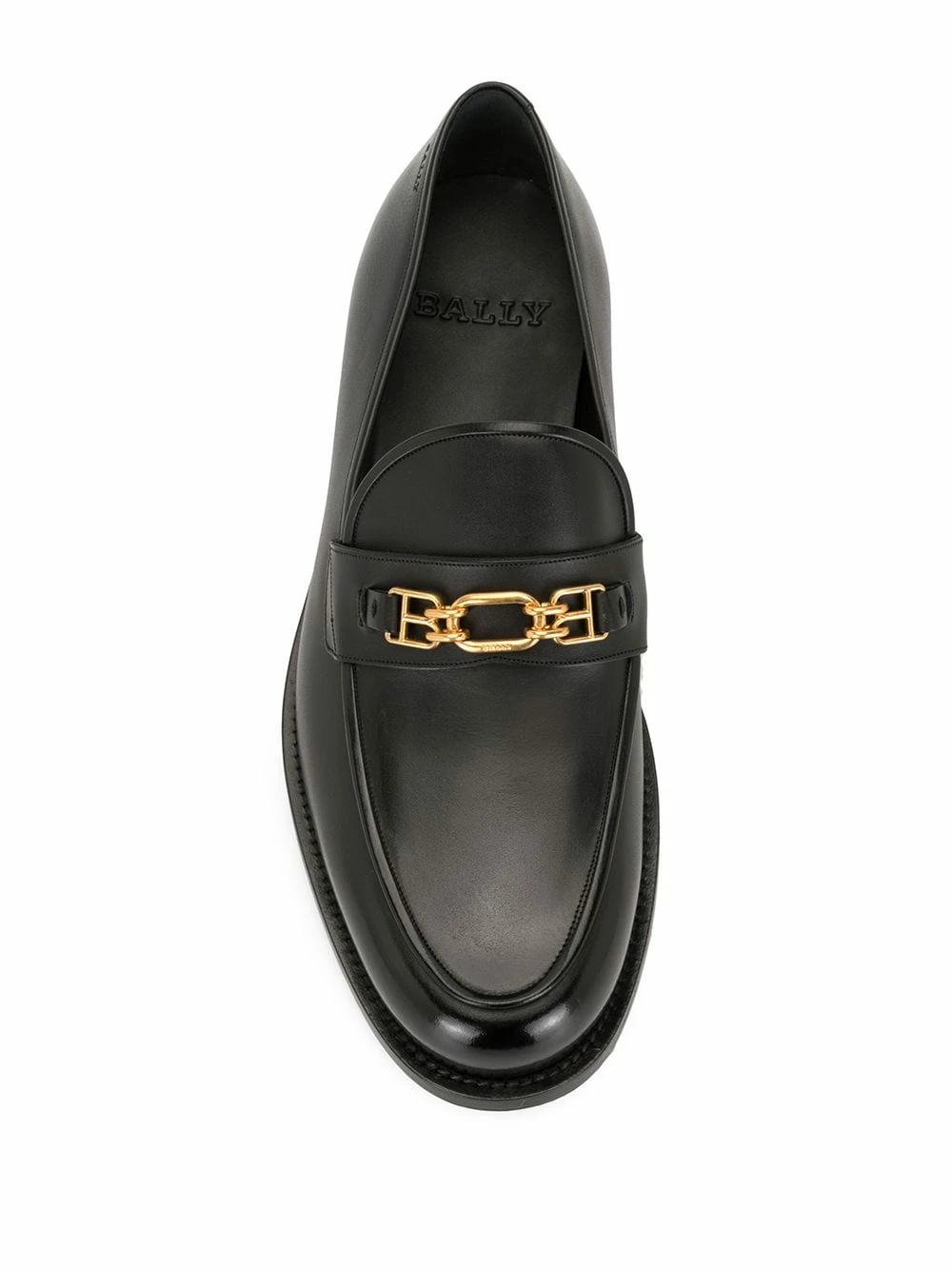 Design à enfiler, finitions en métal doré, plaque logo, bout rond. Matière : cuir.