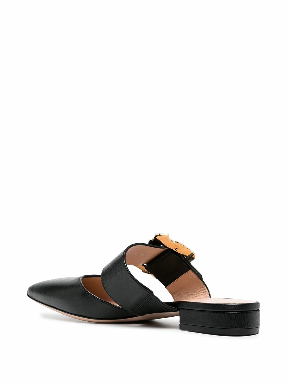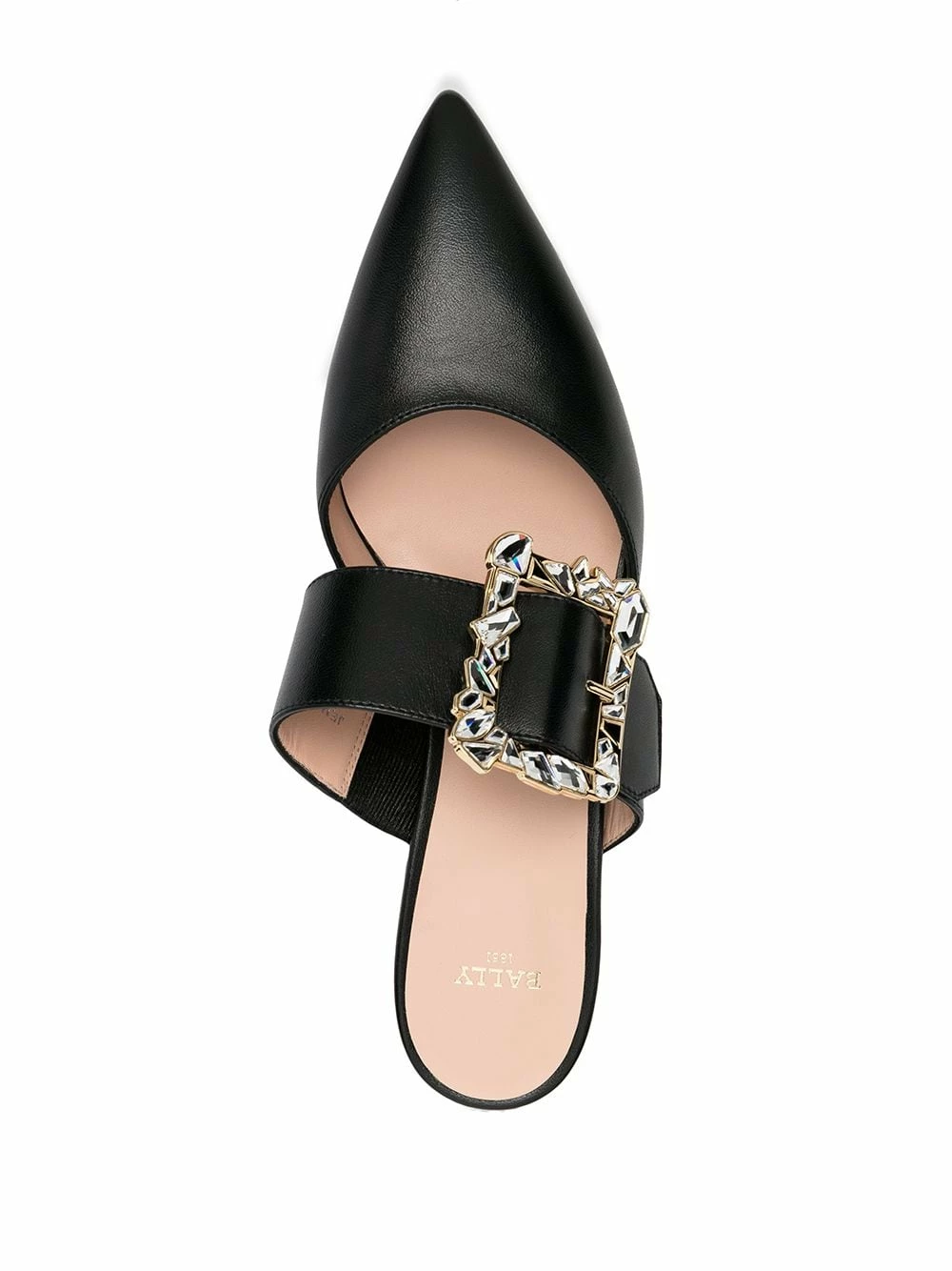 Bout pointu, semelle intérieure griffée, ornement en cristal, fermeture à boucle. Couleur : Noir. Matière : cuir.