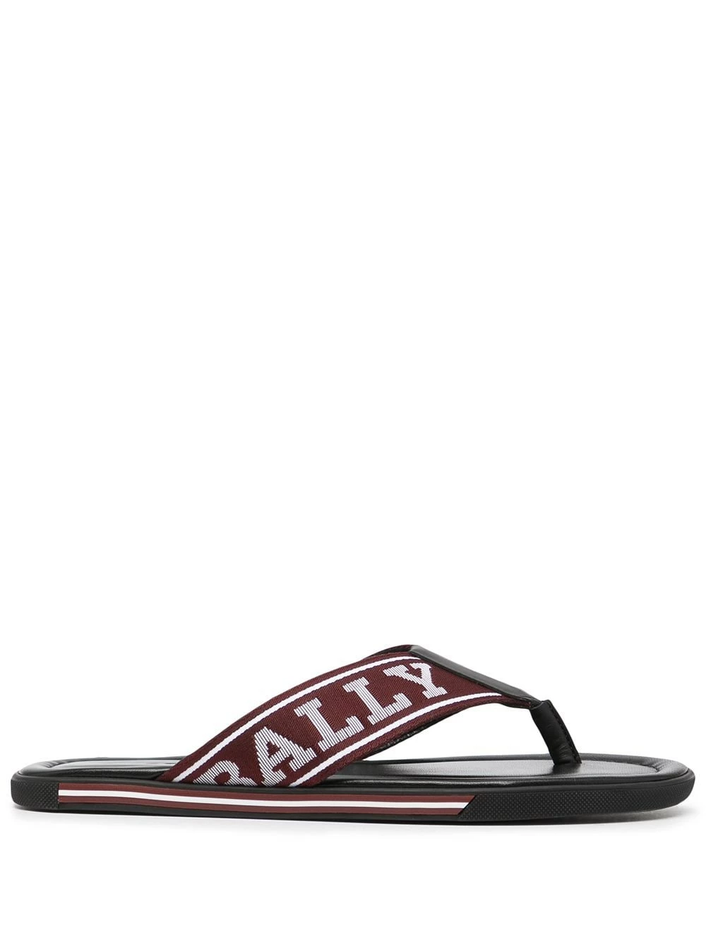 Logo brodé, bout ouvert, semelle plate. Couleur : rouge. Matière : cuir.